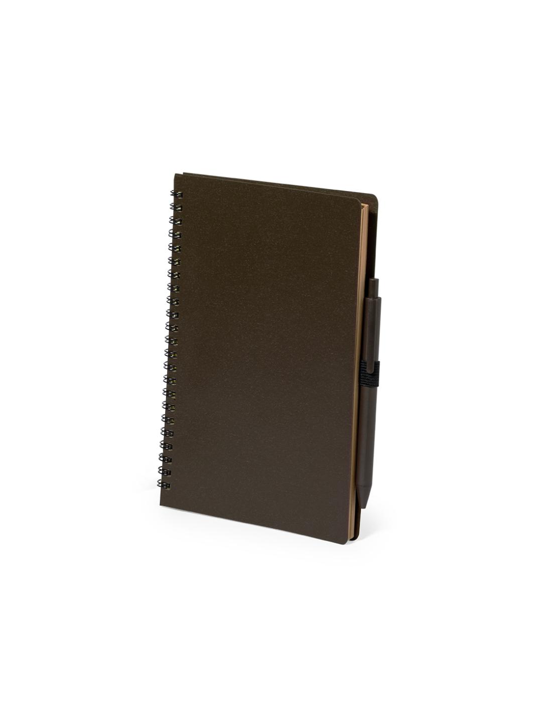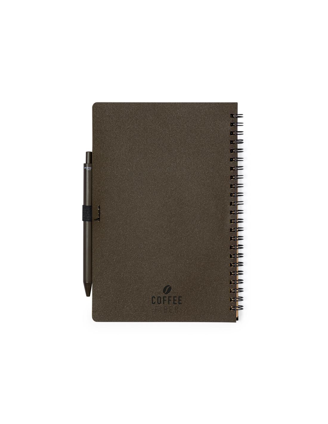 Set de libreta y bolígrafo. Libreta de anillas con tapas fabricadas en suave fibra de café y soporte para el bolígrafo. De 80 hojas con diseño eco y disposición a una raya. Bolígrafo de mecanismo pulsador, con cuerpo en fibra de café y tinta azul. Incluye distintivo fibra de café impreso en libreta y bolígrafo. Presentado en bolsa individual reciclada.La fibra de café se elaborada a partir de los residuos producidos en la obtención del café. Una alternativa sostenible que favorece la reducción del uso de plásticos, ahorrando energía en el proceso de fabricación y fomentando así el cuidado del medio ambiente.