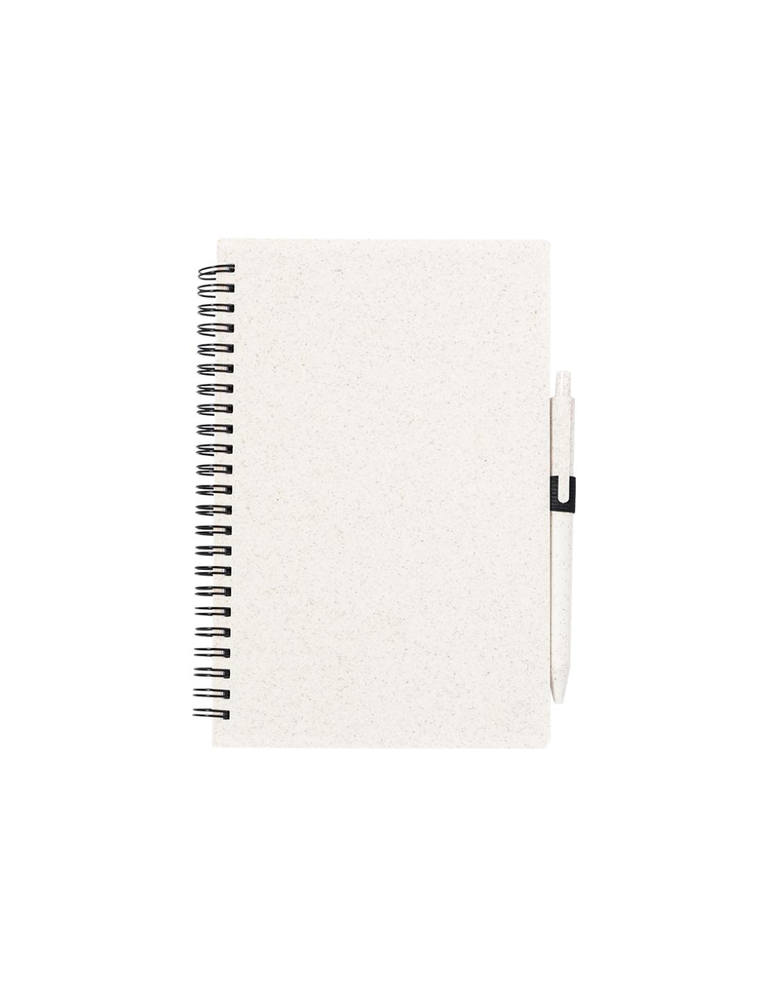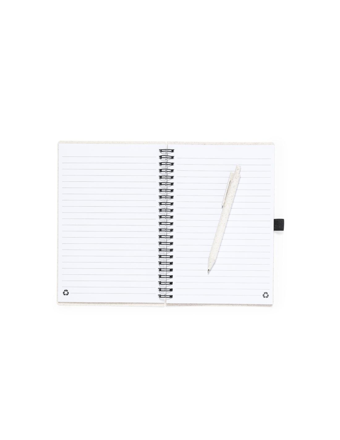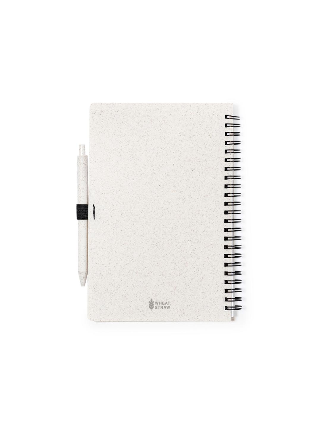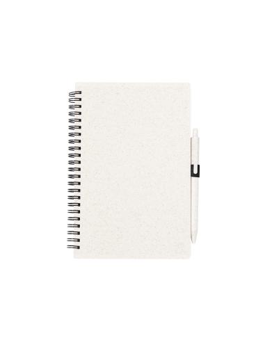 Set de libreta y bolígrafo. Libreta de anillas con tapas en caña de trigo y soporte para el bolígrafo. De 80 hojas con diseño eco y disposición a una raya. Bolígrafo de mecanismo pulsador, con cuerpo en caña de trigo y tinta azul. Con distintivo Wheat Straw. Presentado en bolsa individual reciclada.Elaborado con elementos vegetales para así fomentar la utilización de materias primas naturales y reducir las emisiones contaminantes.