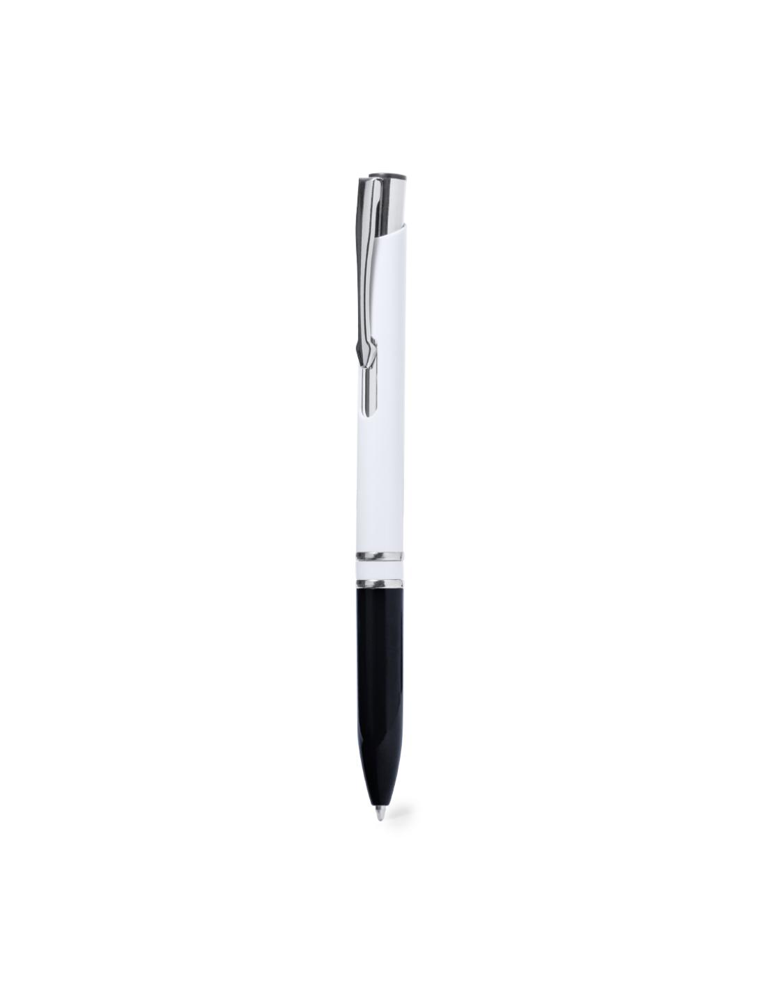 Elegante bolígrafo con mecanismo pulsador. Con cuerpo acabado en color blanco brillo y empuñadura en variada gama colores. Fabricado en resistente ABS acabado brillo. Con carga jumbo y tinta azul.