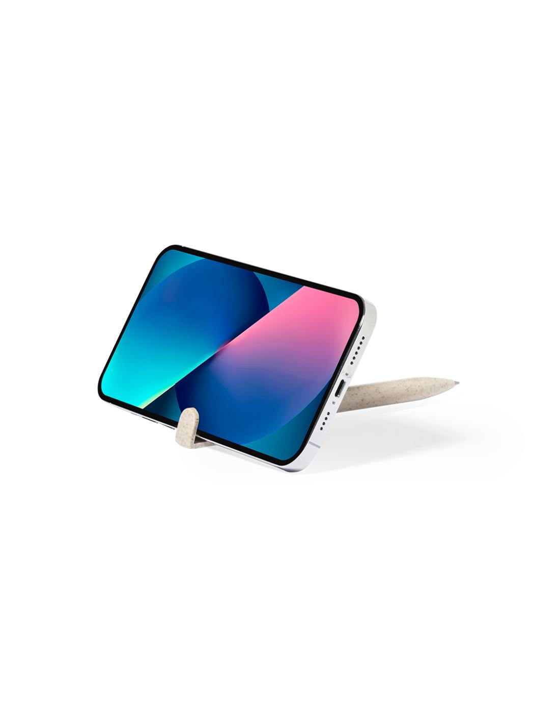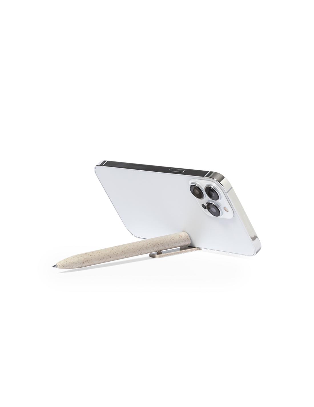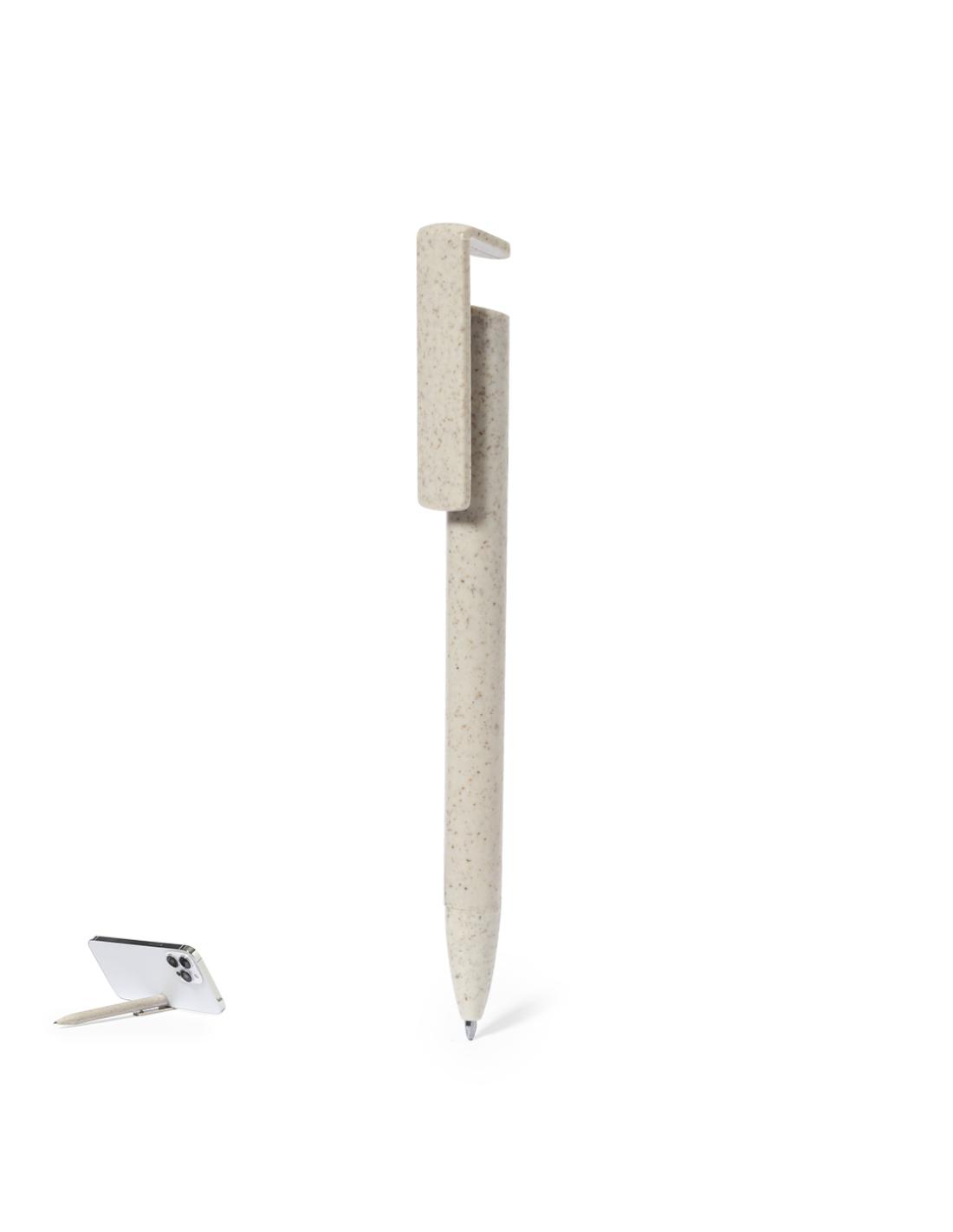 Elegante y práctico bolígrafo fabricado en caña de trigo y ABS. De mecanismo pulsador, con soporte integrado en clip para dispositivo móvil. En tinta azul y con distintivo Wheat Straw en la parte superior del bolígrafo.La caña de trigo fomenta la utilización de materias primas naturales, reduciendo así las emisiones contaminantes.