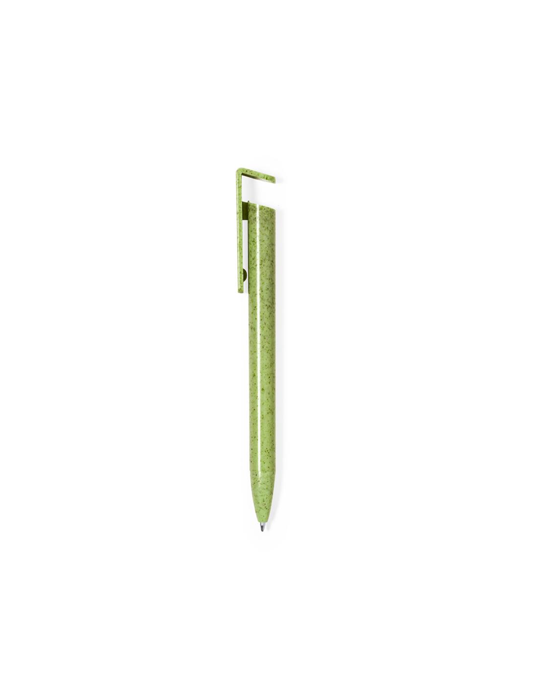 Elegante y práctico bolígrafo fabricado en caña de trigo y ABS. De mecanismo pulsador, con soporte integrado en clip para dispositivo móvil. En tinta azul y con distintivo Wheat Straw en la parte superior del bolígrafo.La caña de trigo fomenta la utilización de materias primas naturales, reduciendo así las emisiones contaminantes.
