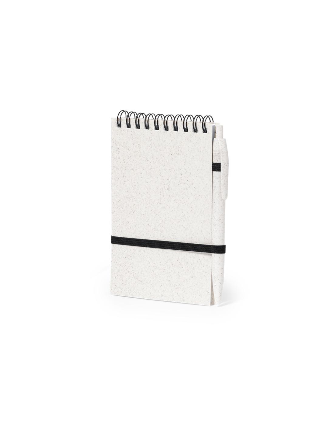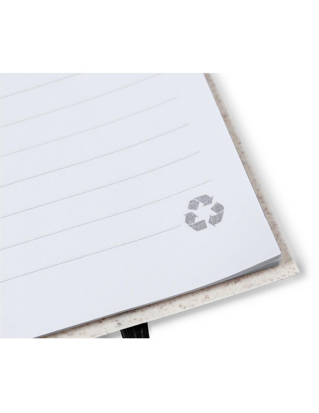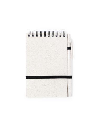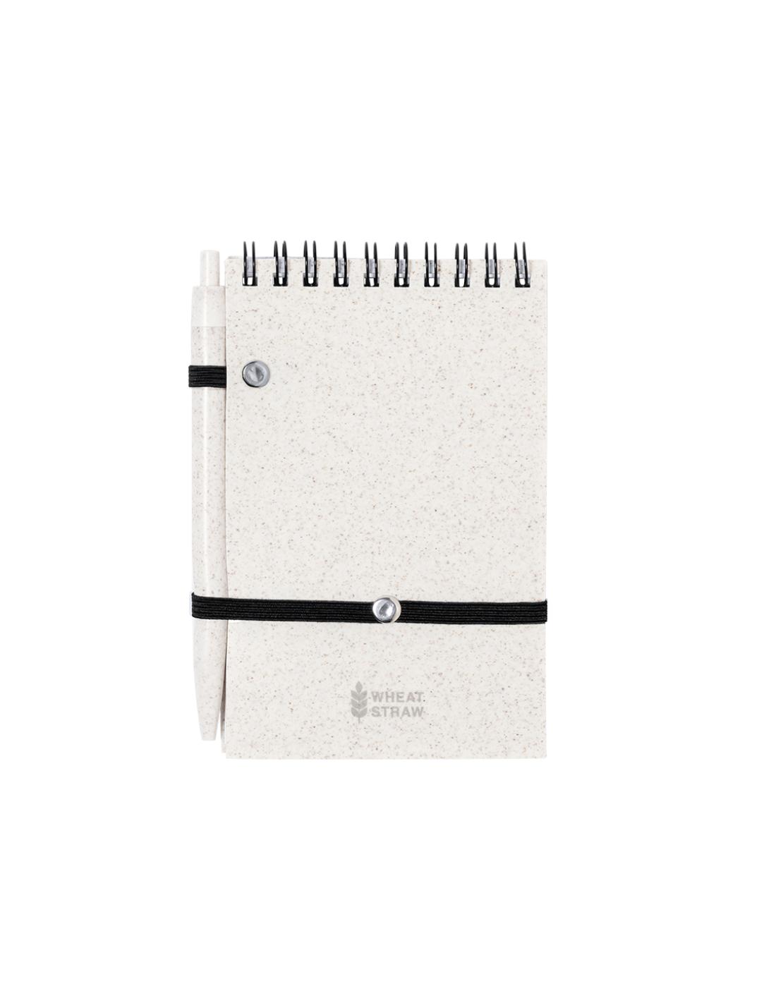 Libreta de anillas con tapas de caña de trigo y bolígrafo a juego, también en caña de trigo. De tamaño compacto, con elástico de cierre en elegante color negro. Incluye 70 hojas con disposición a una raya y diseño eco. Bolígrafo de mecanismo pulsador en caña de trigo con tinta azul. Incluye distintivo Wheat Straw. Presentado en bolsa individual reciclada.Elaborado con elementos vegetales para así fomentar la utilización de materias primas naturales y reducir las emisiones contaminantes.