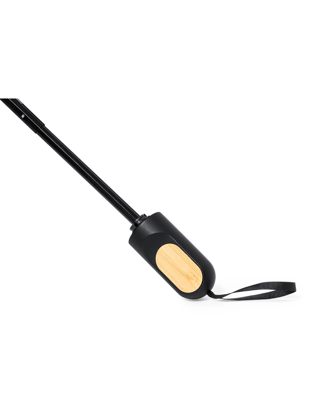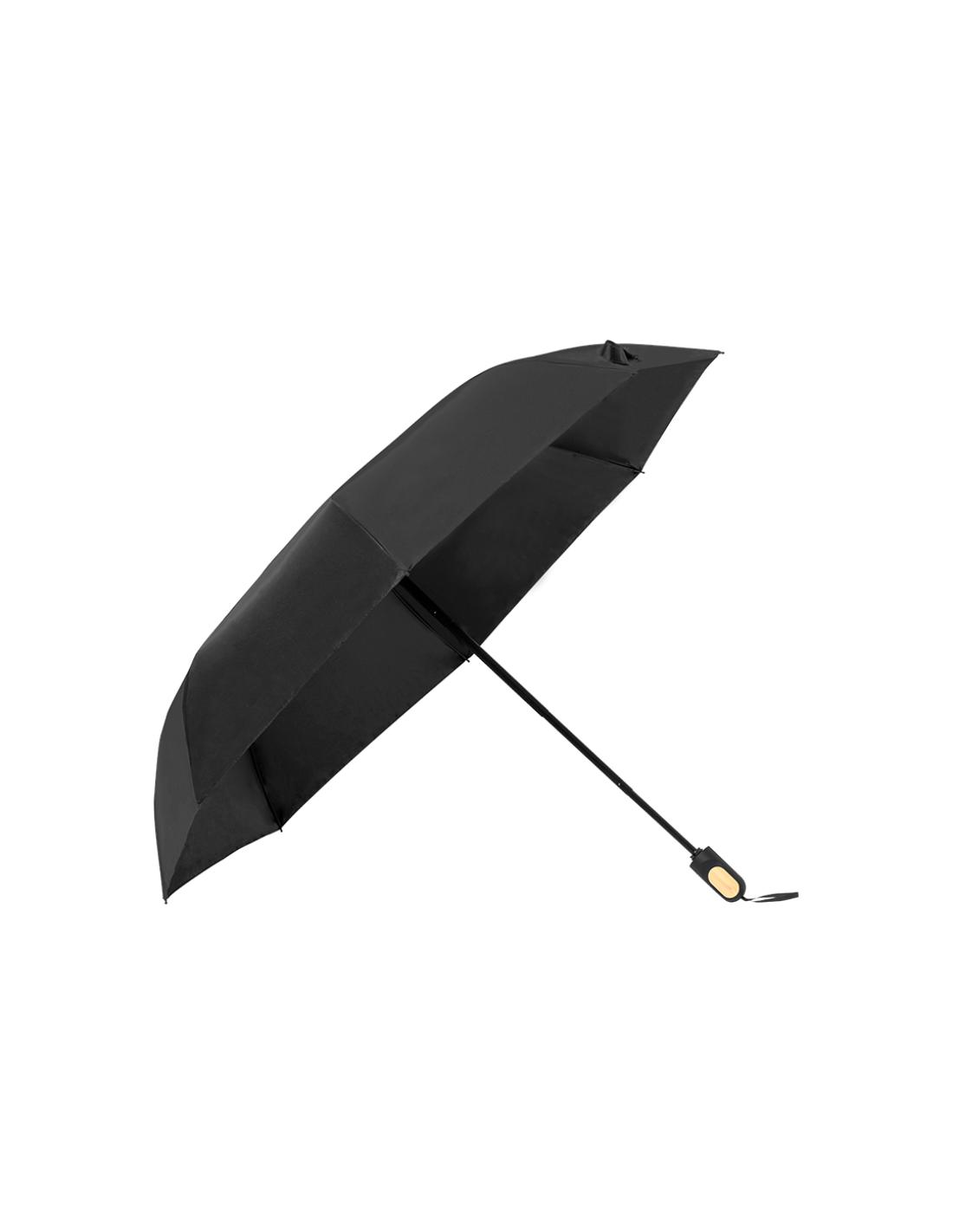 Paraguas plegable de 97cm de diámetro. En material pongee 190T RPET. De apertura manual, con sistema anti viento y varillas fabricadas en fibra de vidrio. Mango ergonómico con elegante detalle en bambú, fácil transporte gracias a su cordón, funda y cierre con velcro a juego. Con etiqueta distintiva RPET. Presentado en bolsa individual reciclada.El material RPET se elabora a partir de plástico reciclado, para así fomentar la reutilización de residuos plásticos y ayudar a la sostenibilidad del planeta.