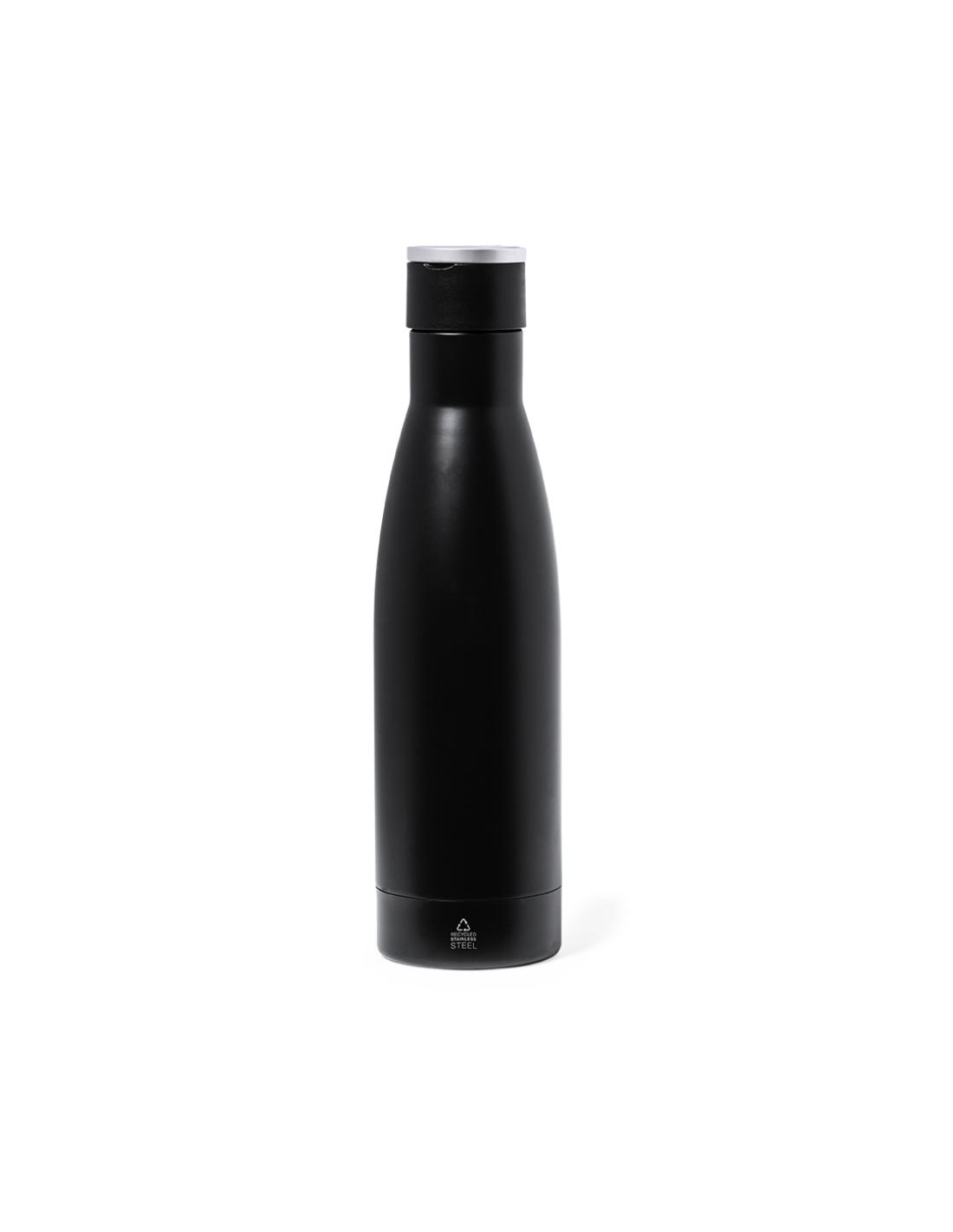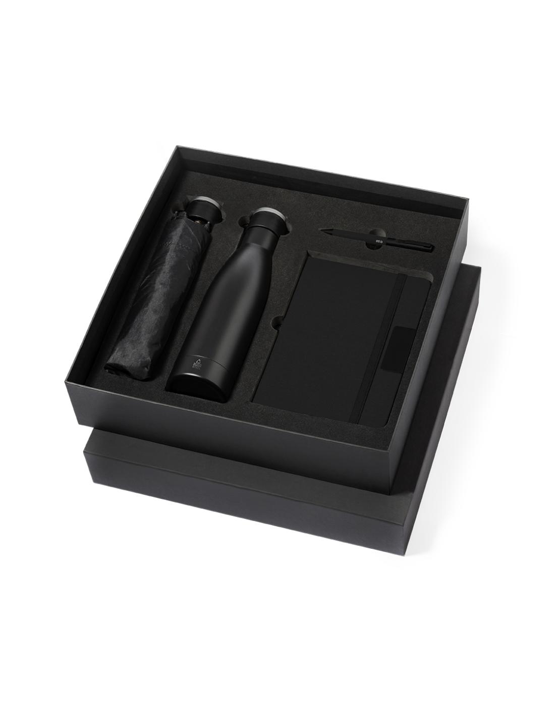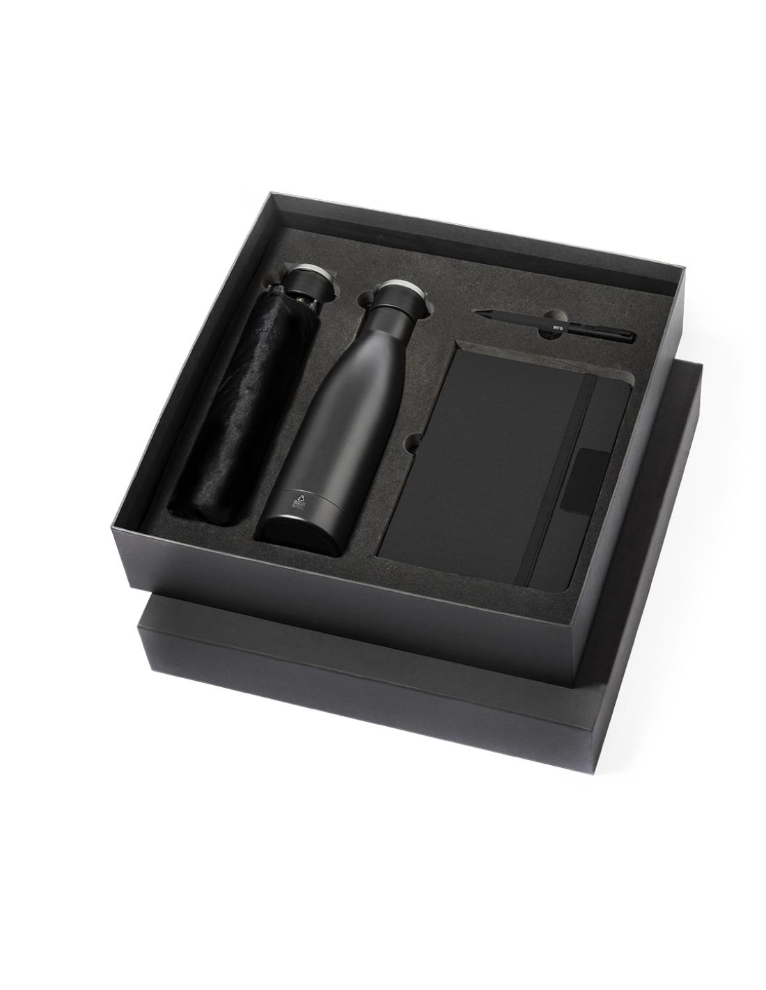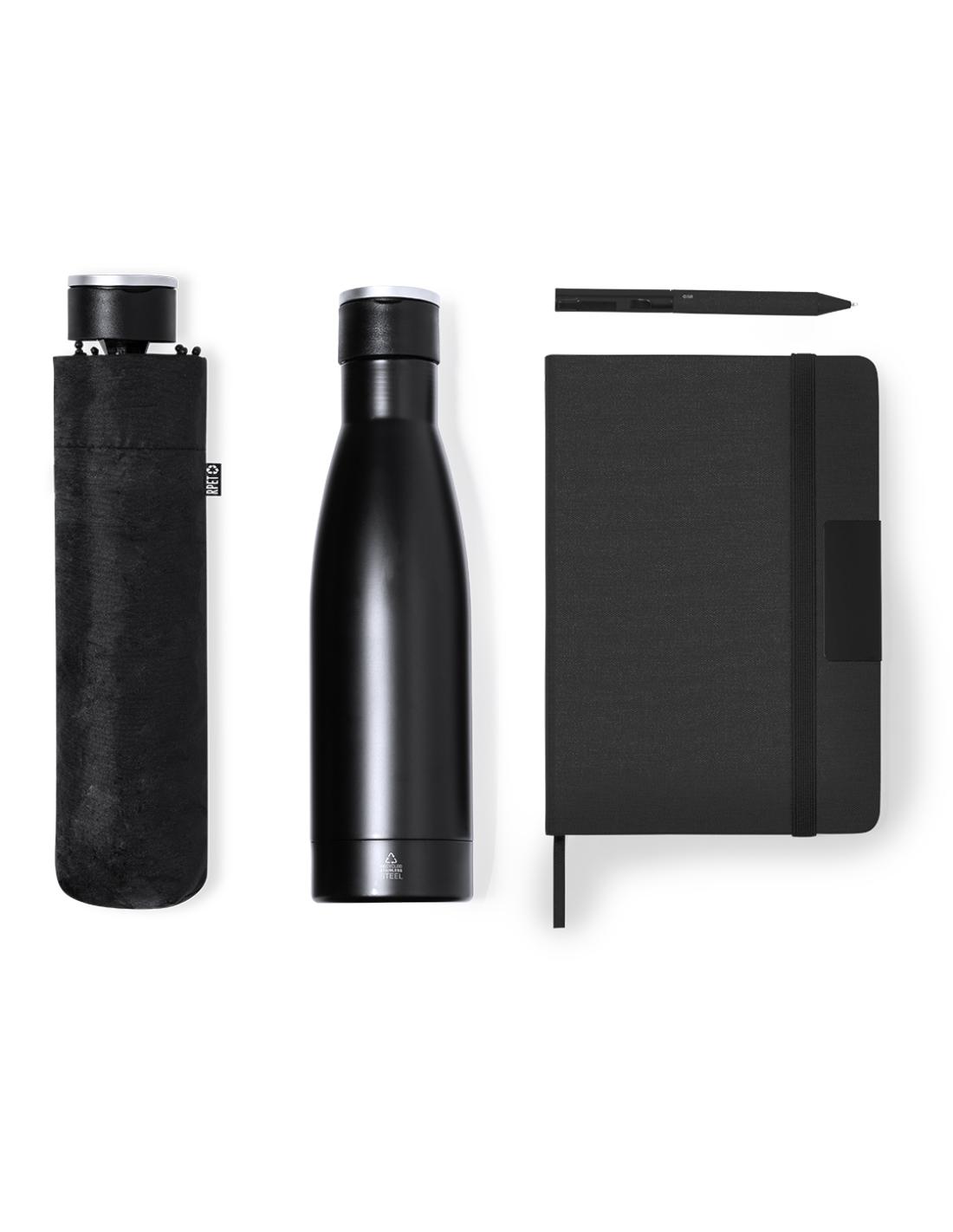 Elegante set premium que incluye:Termo de doble capa en acero inoxidable reciclado de acabado negro mate y de 500 ml de capacidad, con asa rígida de metal color plata mate. Con distintivo acero inoxidableBloc de notas en RPET en elegante color negro, con detalle metálico especial para marcaje en láser. Incluye cierre elástico y marcapáginas de tela. Interior con 80 hojas de disposición a una raya. Con distintivo RPETParaguas plegable de color negro con 98cm de diámetro. En material pongee 190T RPET. De apertura manual, con sistema anti viento y varillas fibra de vidrio. Con funda de transporte y cintas a juego. Con etiqueta distintiva RPET.Bolígrafo en RPET de acabado negro mate, de mecanismo giratorio y tinta azul. El material RPET se elabora a partir de plástico reciclado, para así fomentar la reutilización...