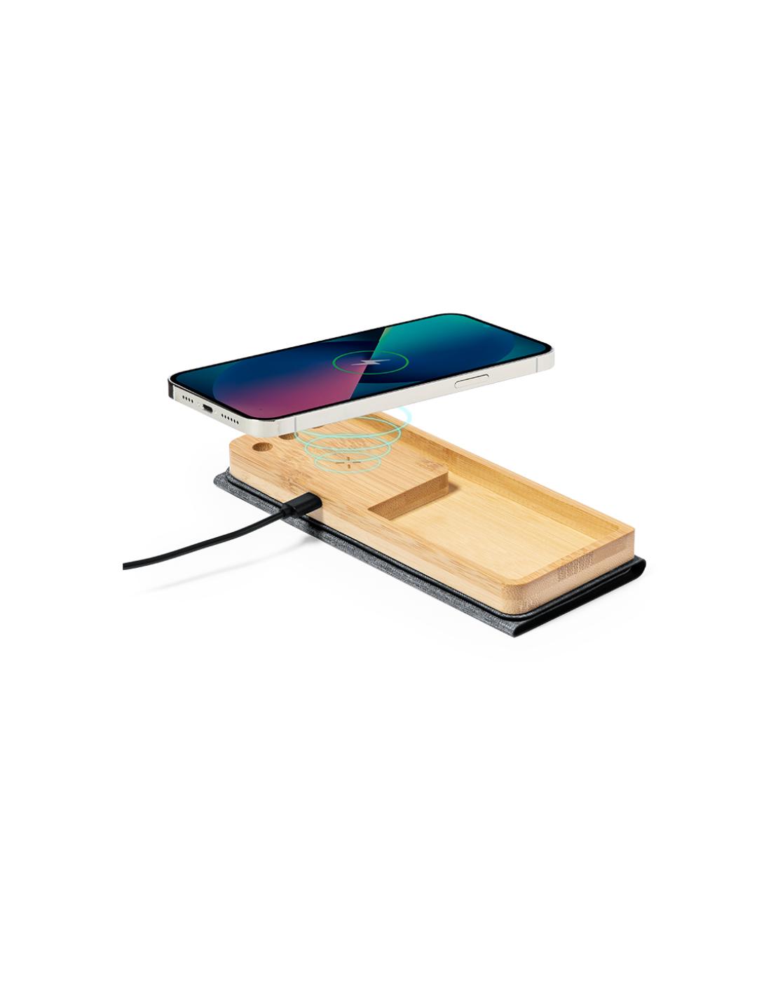 Elegante y funcional alfombrilla plegable fabricada en combinación de suave poliéster RPET y bambú. Con entrada tipo C -cable negro Tipo C incluido- y cargador inalámbrico de 15W,compatible con dispositivos equipados con tecnología de carga inalámbrica Qi. Incluye soporte para smartphone, soporte para bolígrafos, y compartimento libre de almacenaje en bambú. Base antideslizante que garantiza un uso cómodo y estable.Incluye manual de uso en en español e inglés. Presentada en caja individual de diseño kraft y en bolsa reciclada.El material RPET se elabora a partir de plástico reciclado, para así fomentar la reutilización de residuos plásticos y ayudar a la sostenibilidad del planeta.En cumplimiento con los requisitos de seguridad: Sistema de protección contra sobrecalentamiento. Sistema de protección contra...