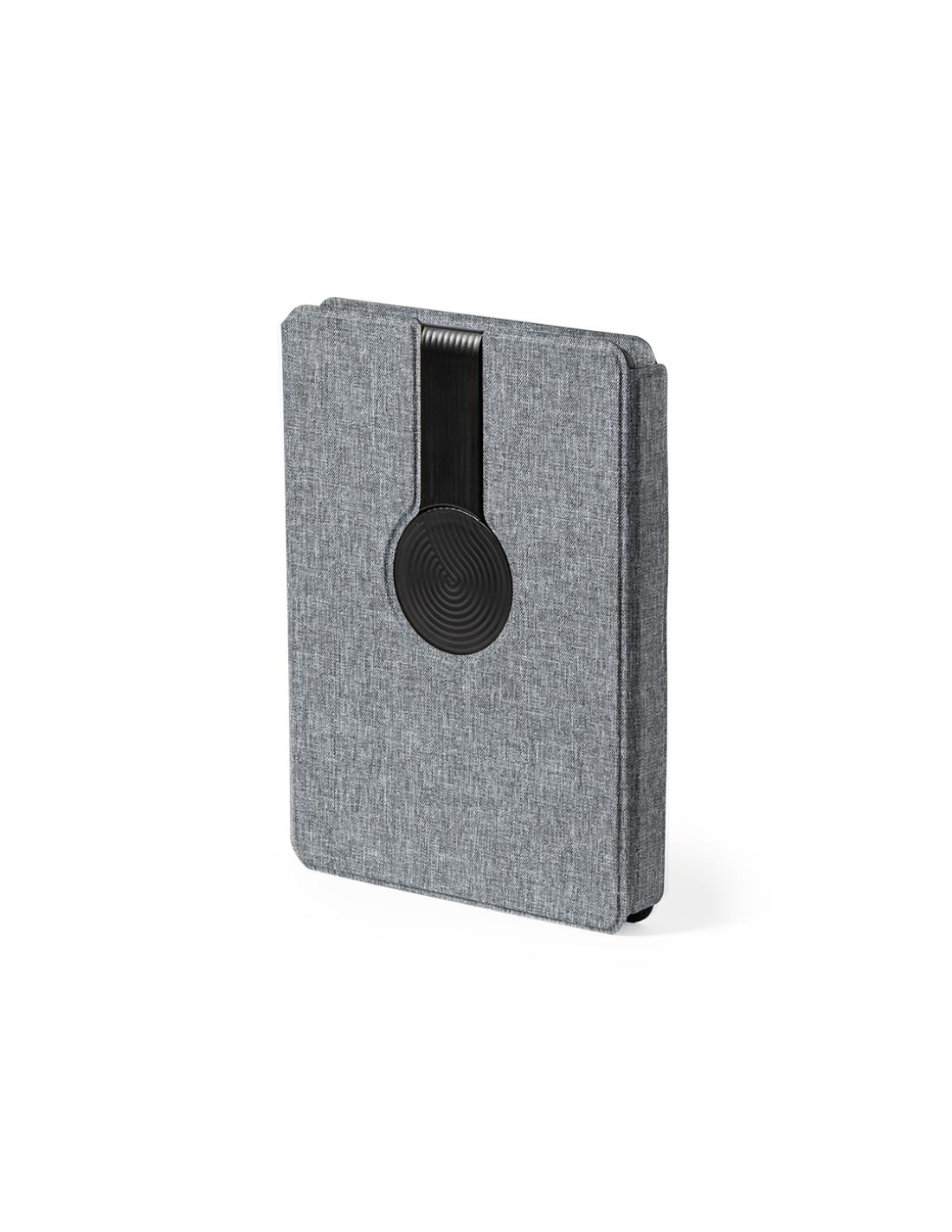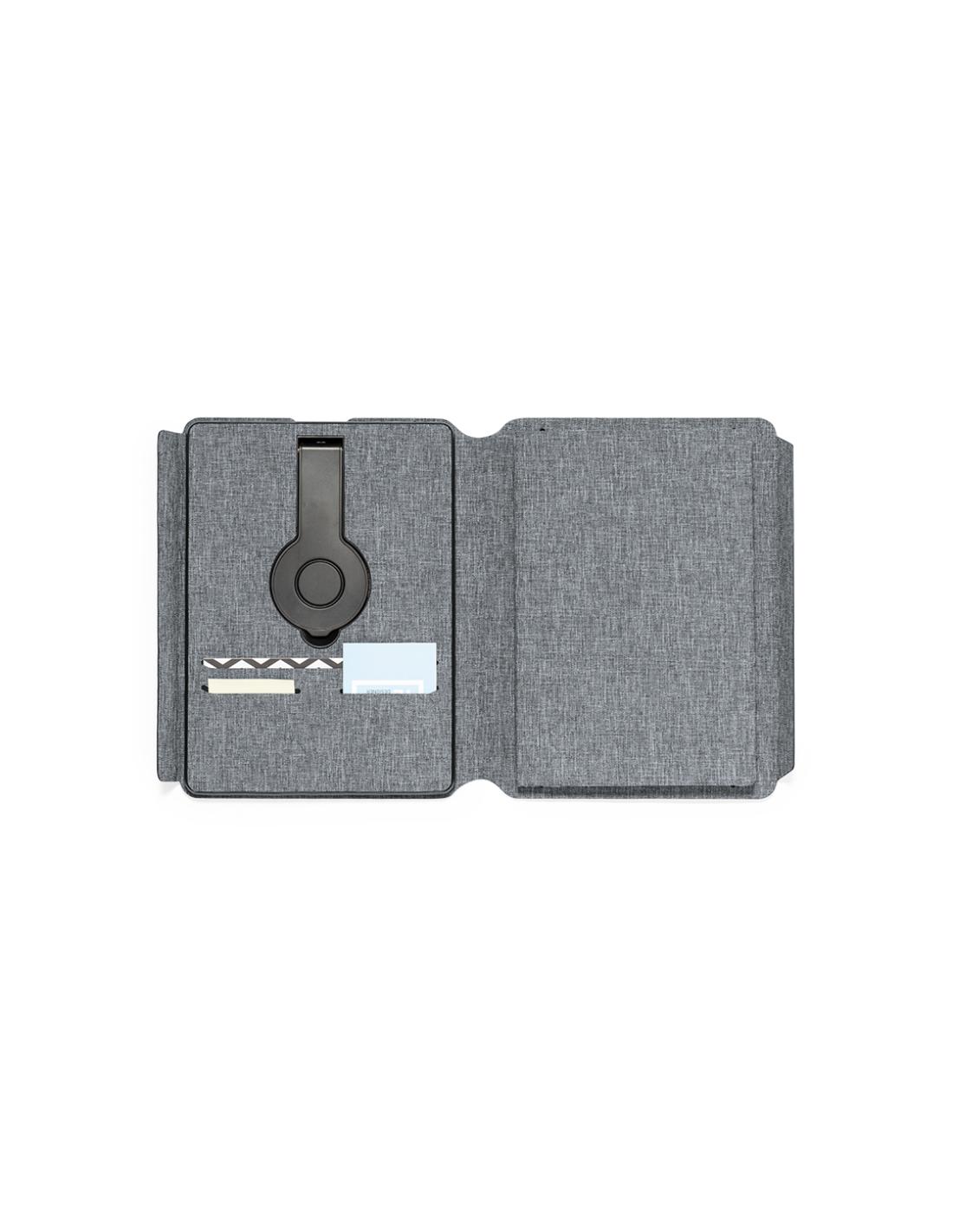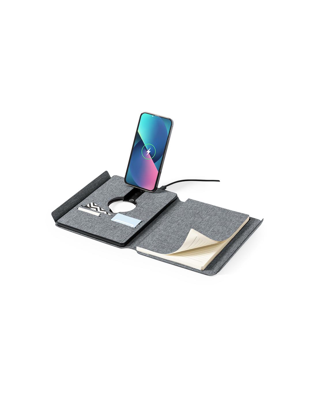 Carpeta/bloc multifunción con cierre magnético fabricada en poliéster 300D RPET, elaborado a partir de plástico reciclado, y etiqueta interior con distintivo RPET.Cargador inalámbrico de 10W, con fijación magnética y multiposición, integrado en portada, que permite usar el dispositivo mientras se está cargando. Accesorio anillo adhesivo incluido, compatible con todos los dispositivos equipados con tecnología Magsafe y Qi. Con cargador inalámbrico para smartwatch en la contraportada interior.Batería integrada de 5.000 mAh de capacidad de carga, con puerto Tipo C de entrada/salida y LEDs indicadores de estado de carga, con cable cargador incluido.Interior con soporte para smartphone y multitud de compartimentos para tarjetas. Soporte para bolígrafo y bloc interior A5 de 64 hojas, con disposición a una raya.Presentada...