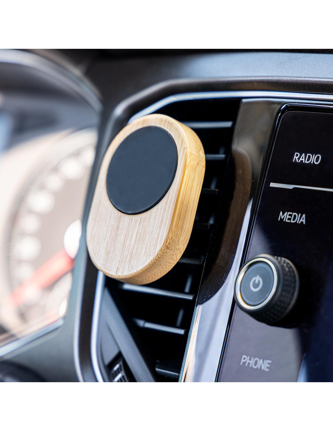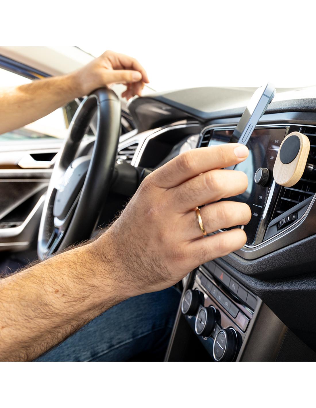 Soporte de rejilla de coche para smartphone fabricado en bambú. Cómoda y segura fijación magnética. Incluye anillo adhesivo. Presentado en caja individual de diseño eco en cartón kraft.Materiales como el bambú fomentan la utilización de materias primas naturales, reduciendo las emisiones contaminantes. Proviene de una planta de gran resistencia, con versatilidad de crecimiento y regeneración rápida, siendo una excelente alternativa al uso de madera tradicional.