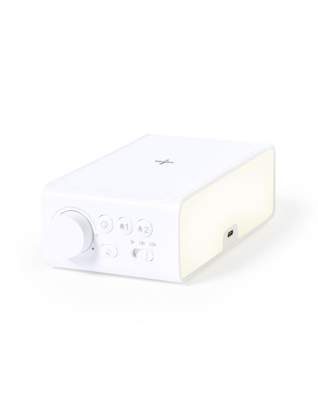 Reloj multifunción de elegante diseño en color blanco con cargador inalámbrico de 10W integrado y lámpara led integrada. Con función fecha/hora, alarma y lámpara de 36 ledes con intensidad de luz regulable. Conexión USB, con cable Tipo C incluido de 100 cm y alimentación auxiliar a pilas de botón (incluida). Compatible con dispositivos equipados con tecnología de carga inalámbrica. Presentado en atractiva caja de diseño.En cumplimiento con los requisitos de seguridad: Sistema de protección contra sobrecalentamiento. Sistema de protección contra sobrecarga.