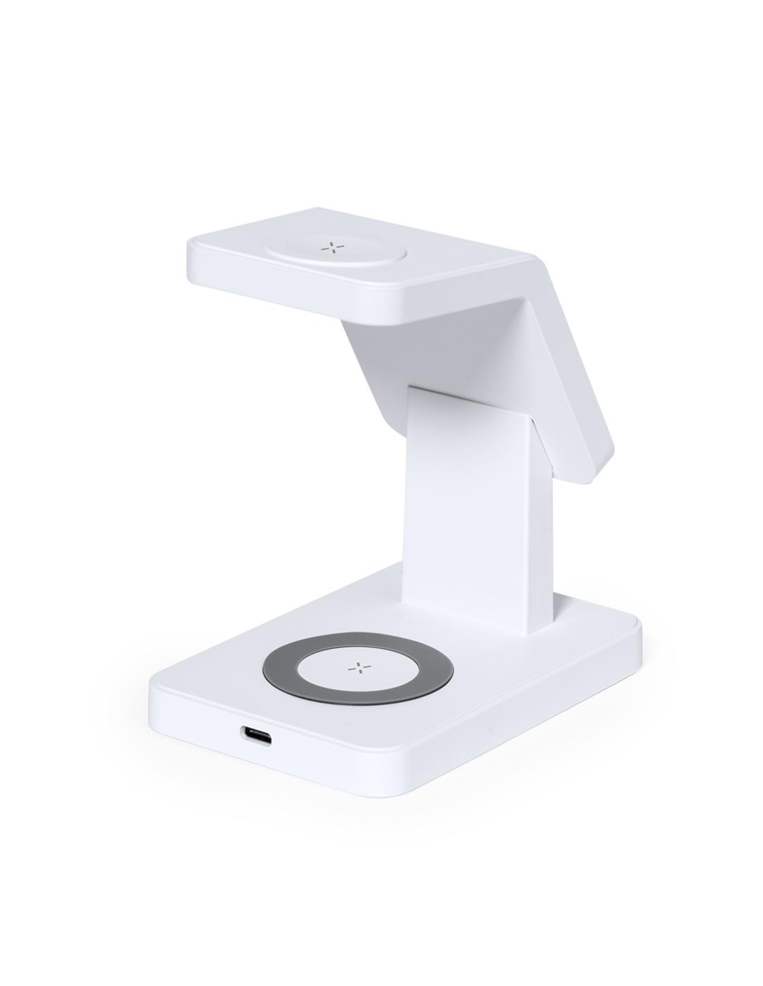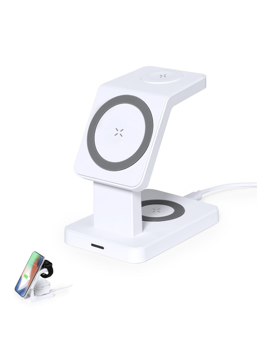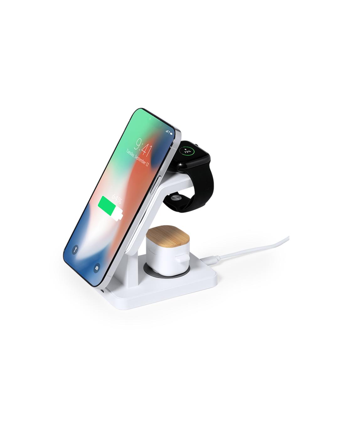 Completo multicargador inalámbrico 15W con soporte para gadgets. Diseñado para la carga simultánea del smartphone, auriculares y smartwatch: una estación de carga todo en uno. Presentado en caja de diseño kraft. Disponible manual de instrucciones en español e inglés.