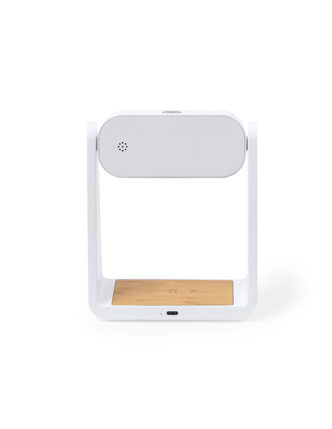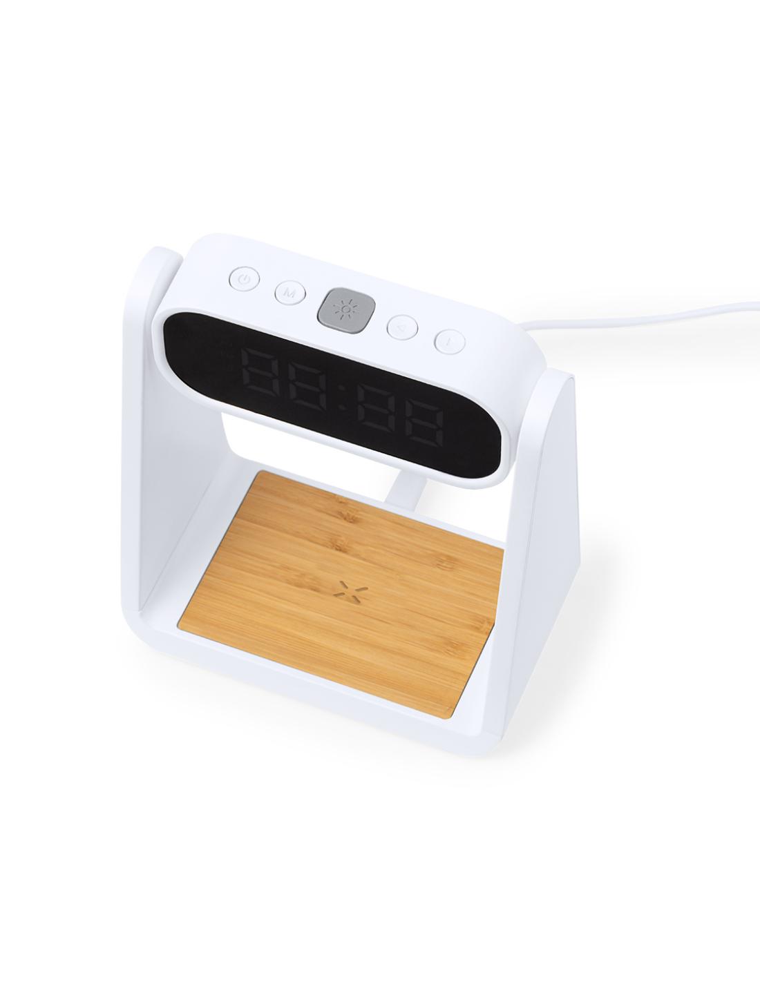 Reloj multifunción con pantalla retroiluminada, función lámpara y cargador inalámbrico 10W integrado. Fabricado en resistente ABS y bambú, de elegante diseño en color blanco, con funciones hora (12/24h) y alarma (3) . Pantalla con intensidad regulable, compatible con dispositivos equipados con tecnología de carga inalámbrica Qi y lámpara con 6 LEDs. Presentado en caja individual de diseño kraft y protector de papel, con manual de instrucciones en español en inglés.Elaborado con elementos vegetales para así fomentar la utilización de materias primas naturales y reducir las emisiones contaminantes.
