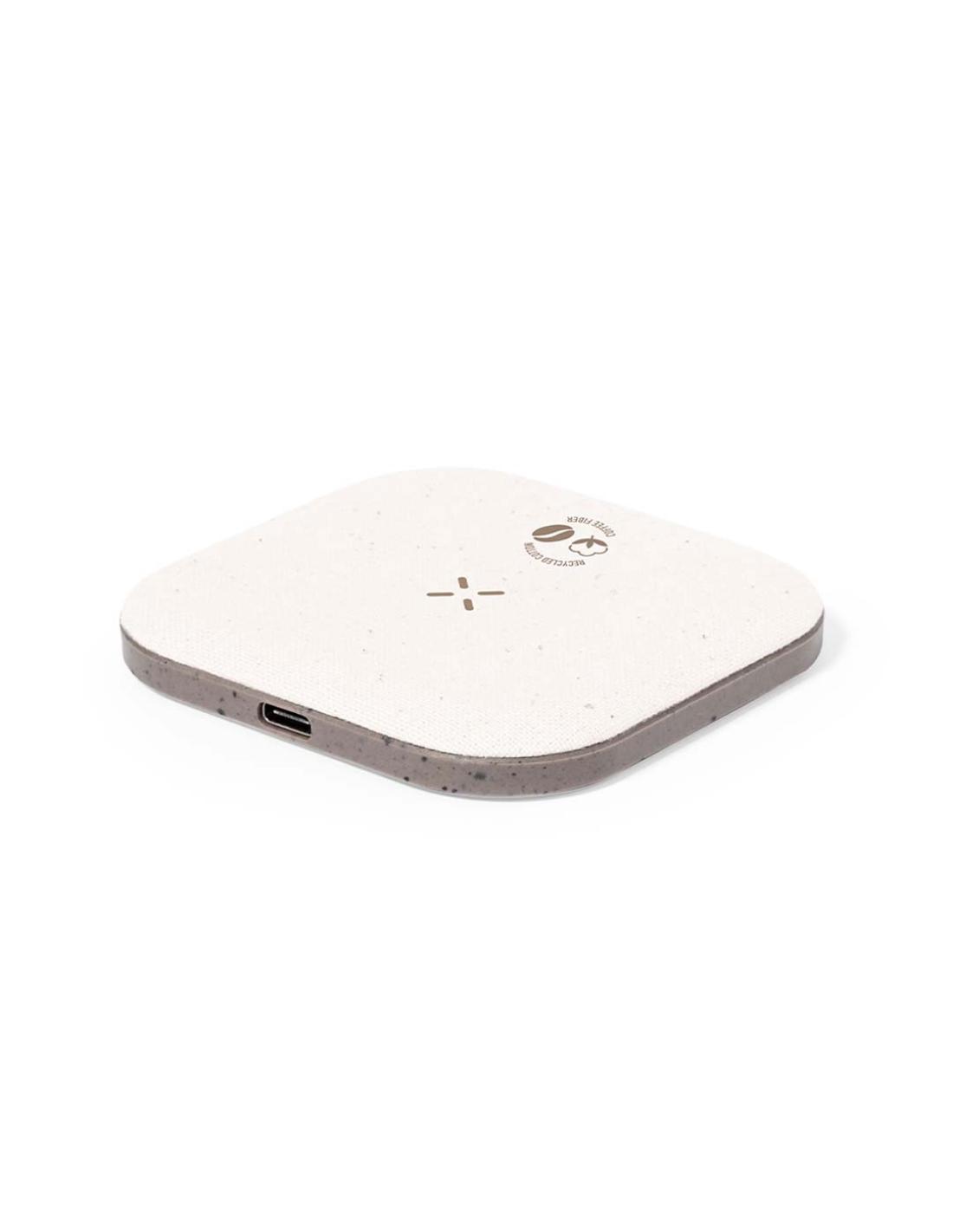 Cargador inalámbrico fabricado en fibra de café y algodón reciclado. Base antideslizante y compatible con dispositivos equipados con tecnología de carga Qi. Capacidad de carga de 15W, con cable negro Tipo C incluido. Con distintivos de fibra de café y algodón reciclado. Presentado en atractiva caja de diseño kraft, con manual de instrucciones en español e inglés.La fibra de café es una solución circular que se obtiene de la utilización de los residuos producidos en la obtención del café. Una alternativa sostenible que favorece la reducción del uso de plásticos, ahorrando energía en su proceso de fabricación y contribuyendo al cuidado del medio ambiente.Disponible certificación GRS (Global Recycled Standard / Estándar de Reciclaje Global), que garantiza el origen reciclado del material usado para fabricar...