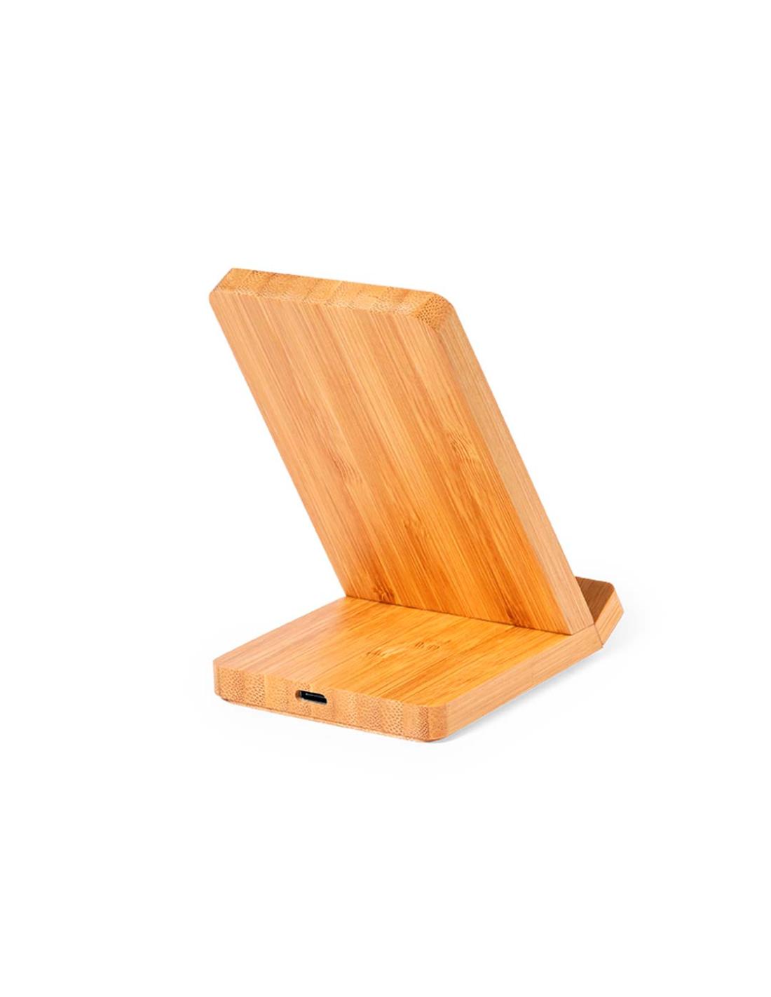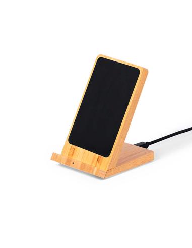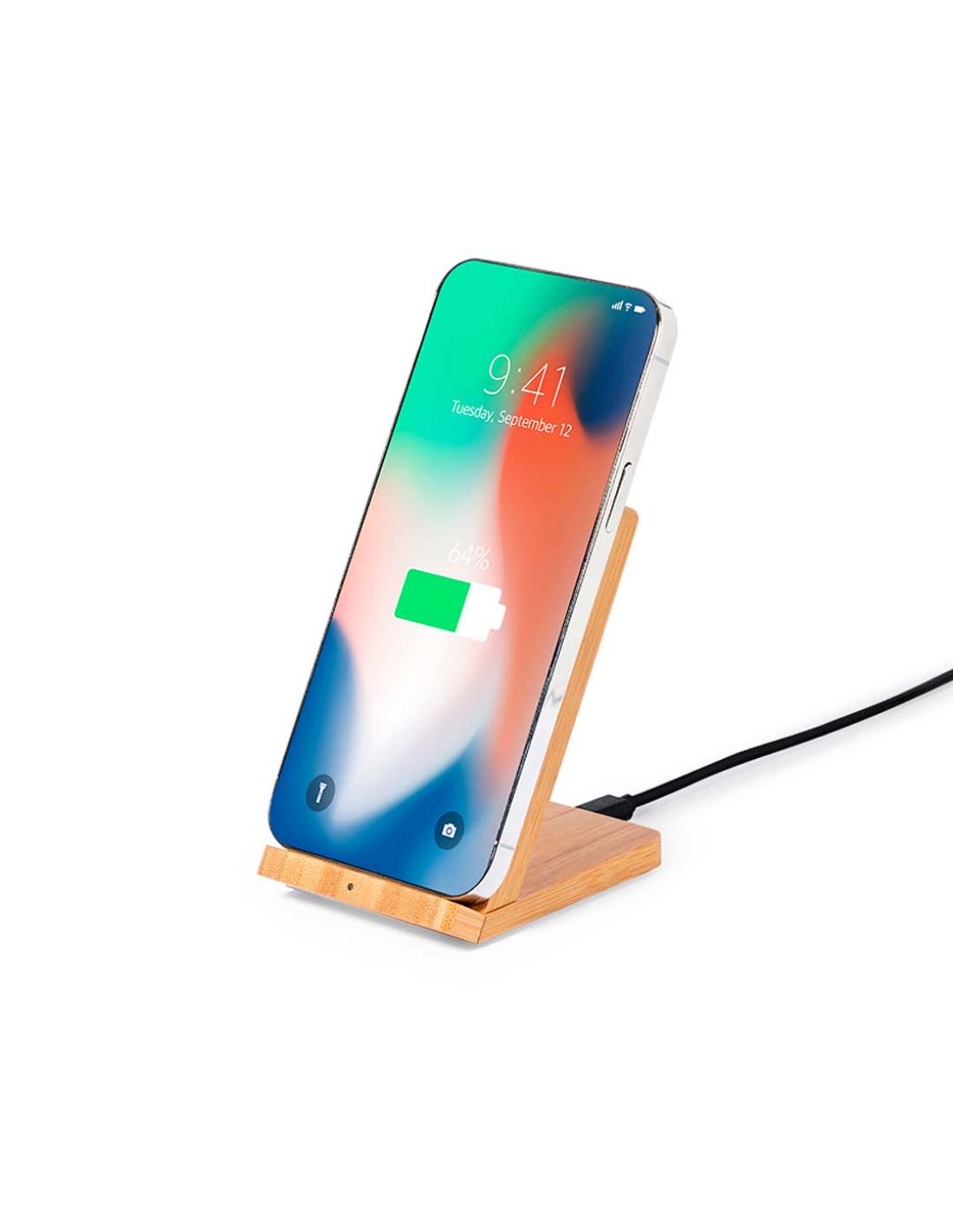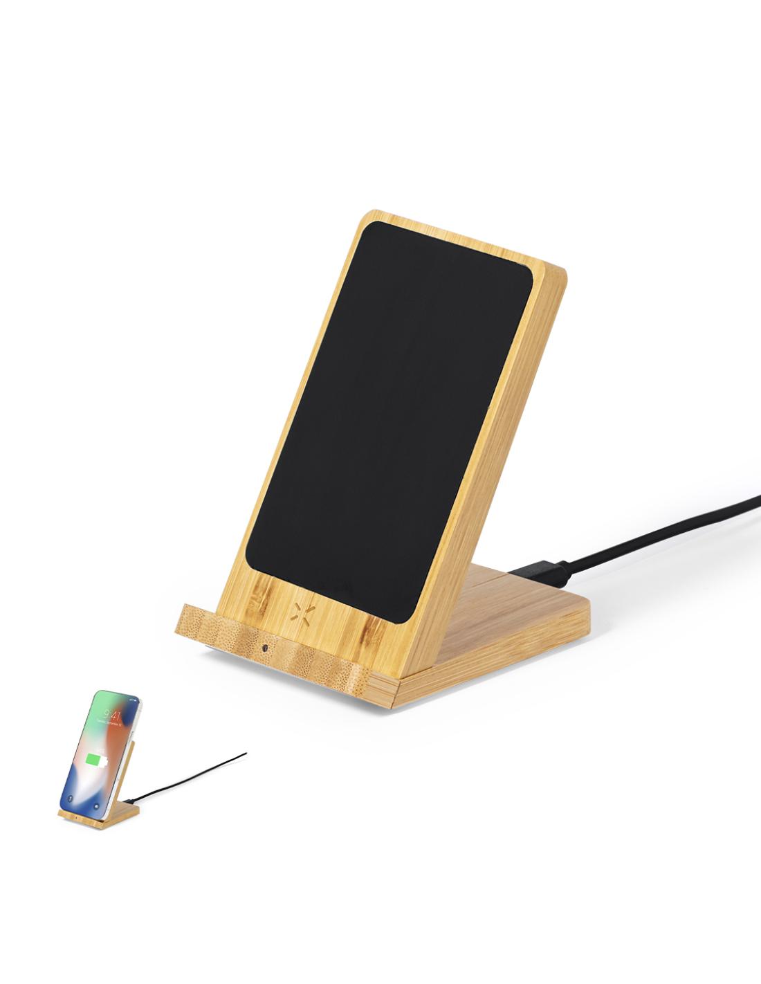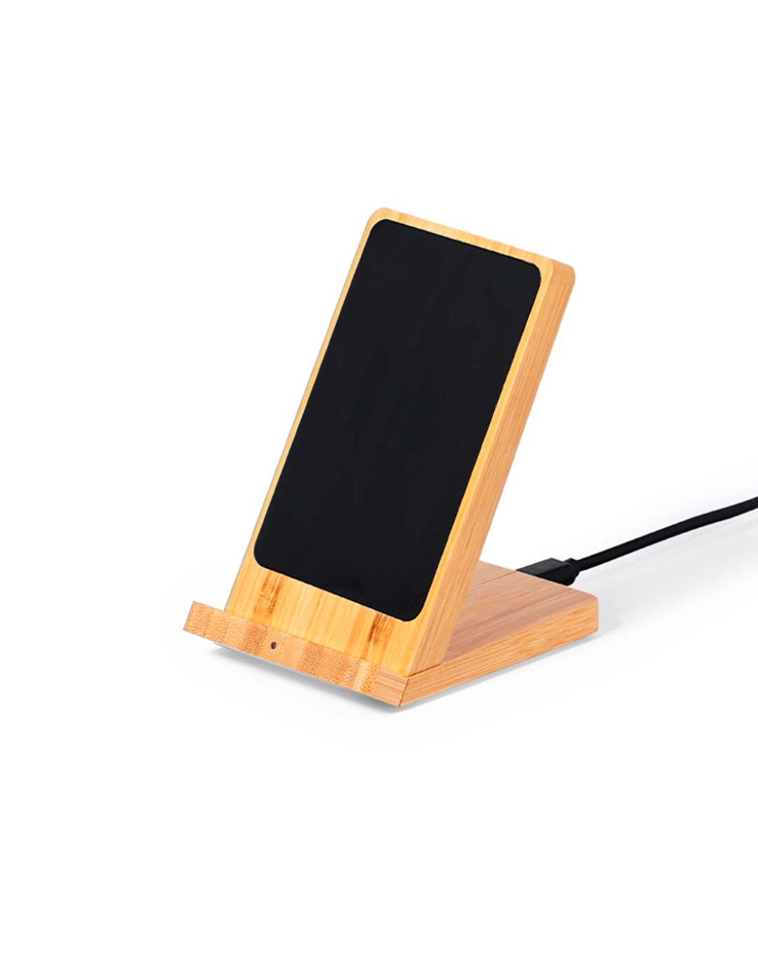 Cargador inalámbrico con función soporte para smartphone. Fabricado en bambú, con superficie en elegante color negro. Luz led interior y recubrimiento exterior especialmente diseñado para marcaje en láser, iluminando así el logotipo. Con función carga de 15W y compatible con dispositivos equipados con tecnología Qi. Amplia superficie de marcaje y presentado en atractiva caja de diseño kraft.