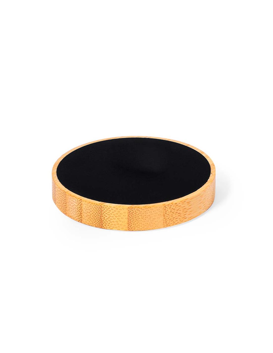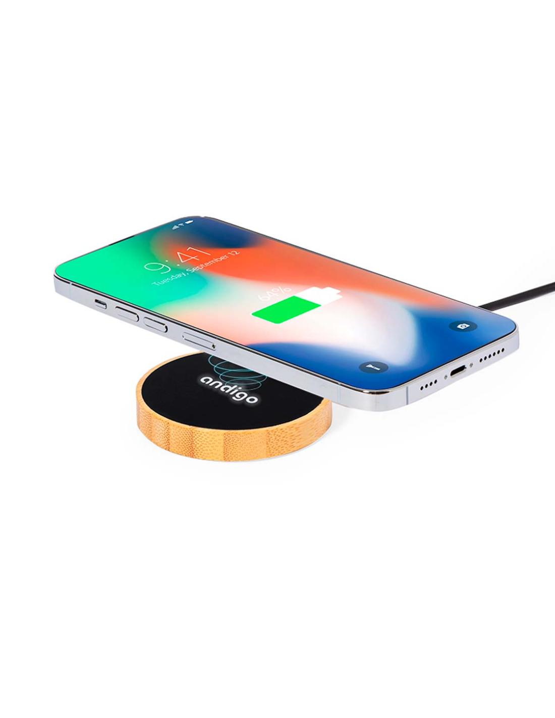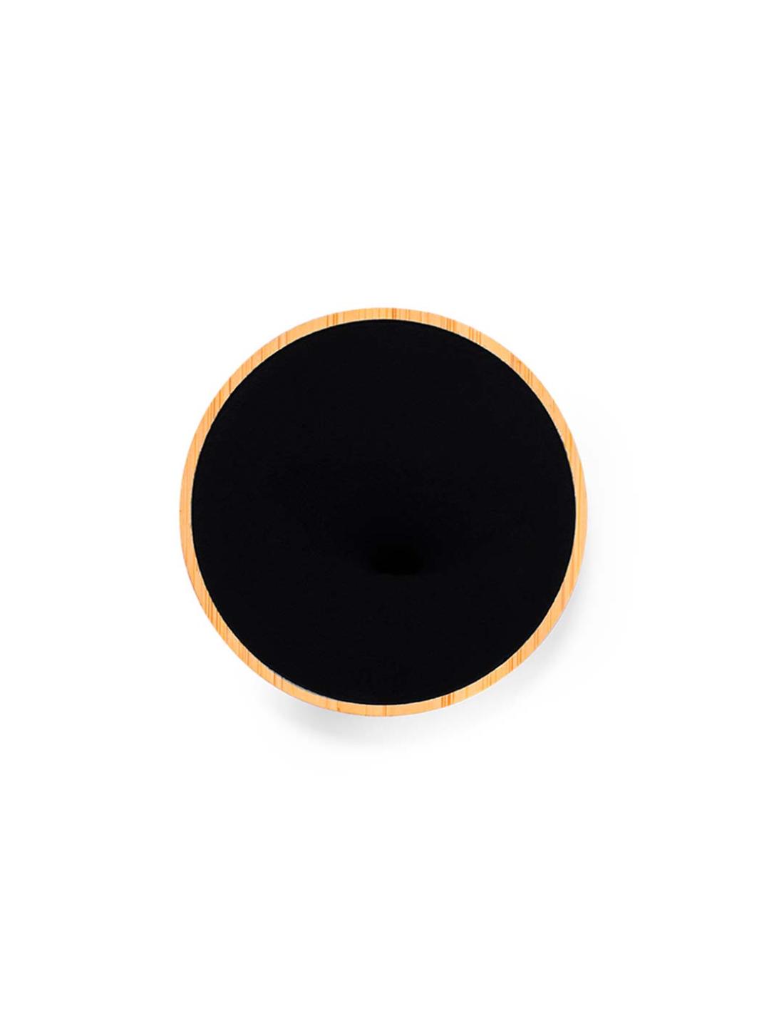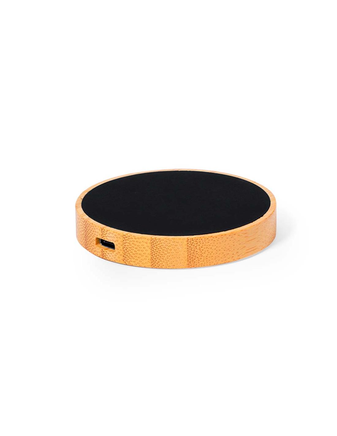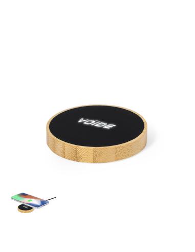 Cargador inalámbrico circular. Fabricado en bambú, con superficie en elegante color negro. Luz led interior y recubrimiento exterior especialmente diseñado para marcaje en láser, iluminando así el logotipo. Con función carga de 15W, compatible con dispositivos equipados con tecnología de carga inalámbrica Qi. Con base antideslizante, incluye cable cargador Tipo C y manual de instrucciones en español e inglés. Presentado en caja individual de diseño kraft.