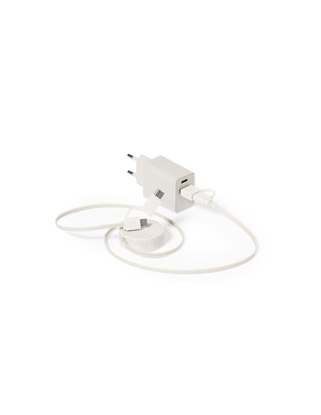Set de cargador USB de pared con carga rápida y cable cargador con transferencia de datos, fabricados en fibra de trigo. Cargador con salida USB y Tipo C, y cable extensible con conexión Micro USB, Tipo C y Lightning. Enchufe europeo. Presentado en bolsa de algodón crudo 100% natural, con cierre de cordón.La caña de trigo fomenta la utilización de materias primas naturales, reduciendo así las emisiones contaminantes.