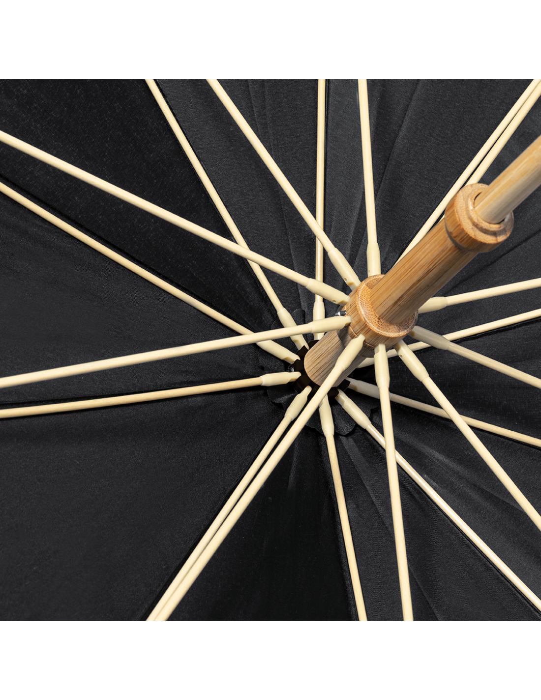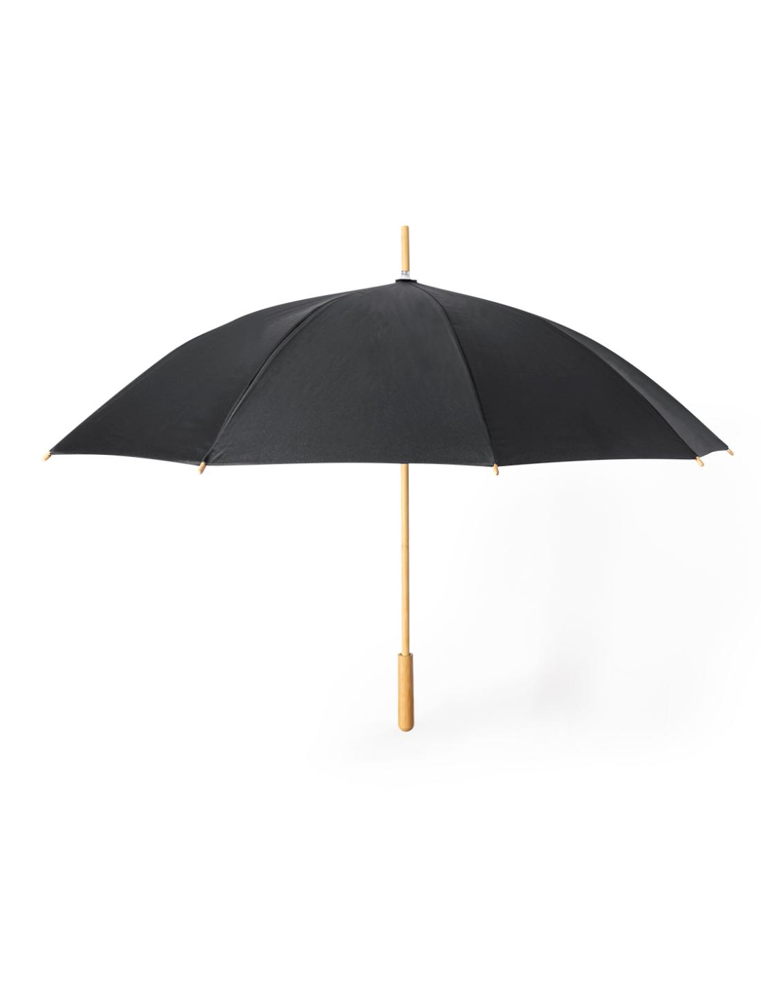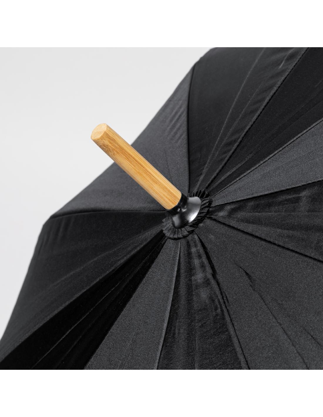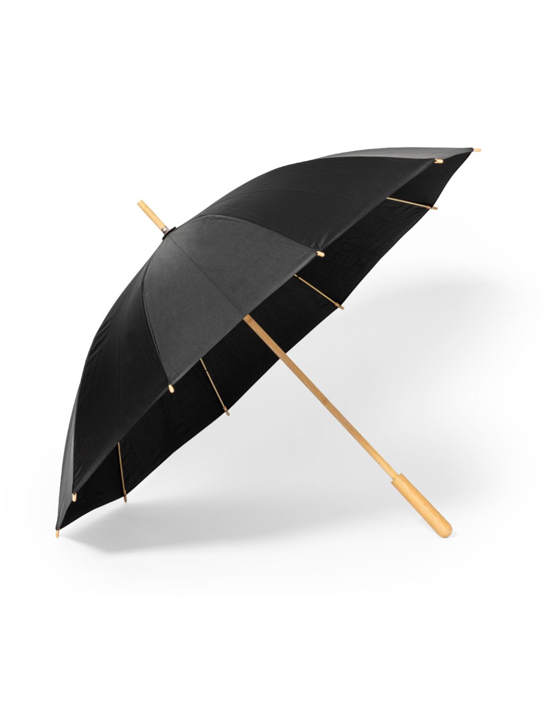 Paraguas de 140cm de diámetro en material pongee 190T RPET. Apertura manual y varillas de fibra de vidrio antiviento, de elegante color negro con cierre de velcro. Mango recto hecho en bambú y etiqueta distintiva RPET.El material RPET se elabora a partir de plástico reciclado, para así fomentar la reutilización de residuos plásticos y ayudar a la sostenibilidad del planeta.