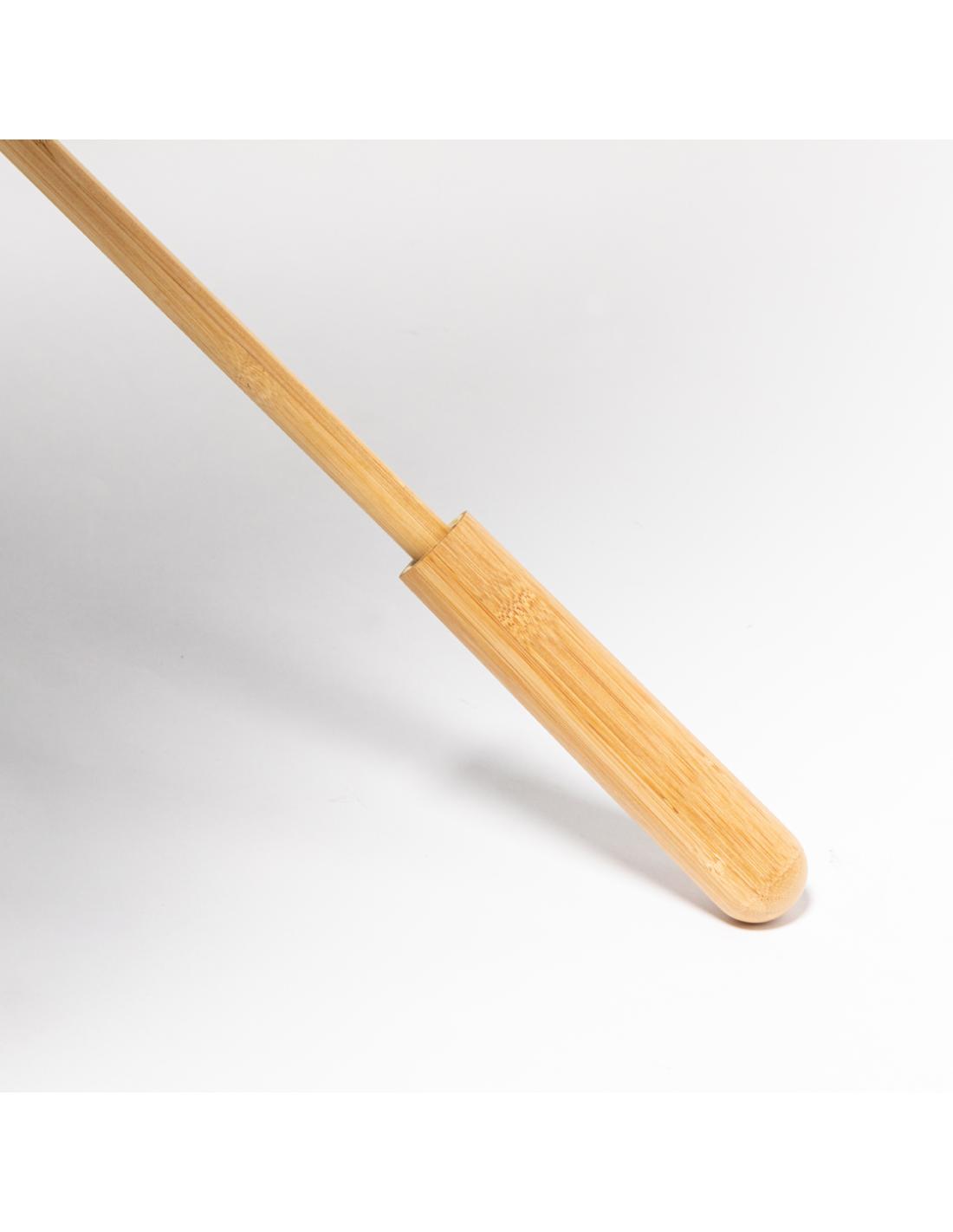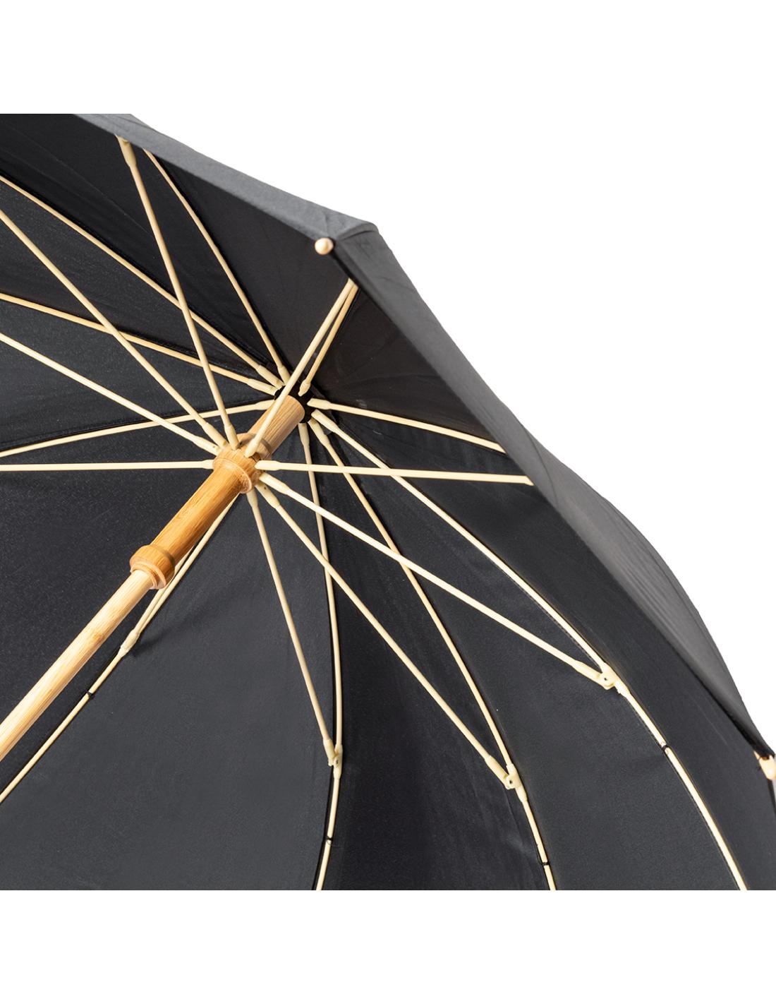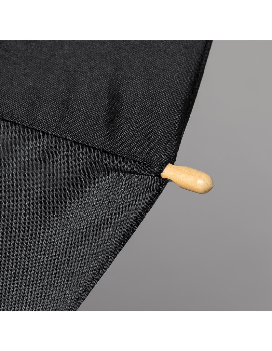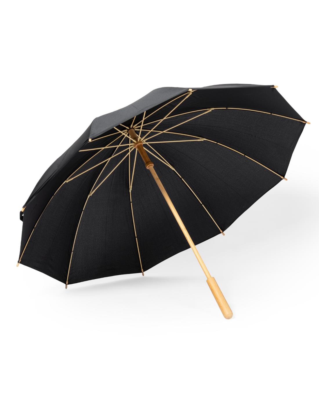 Paraguas de 140cm de diámetro en material pongee 190T RPET. Apertura manual y varillas de fibra de vidrio antiviento, de elegante color negro con cierre de velcro. Mango recto hecho en bambú y etiqueta distintiva RPET.El material RPET se elabora a partir de plástico reciclado, para así fomentar la reutilización de residuos plásticos y ayudar a la sostenibilidad del planeta.