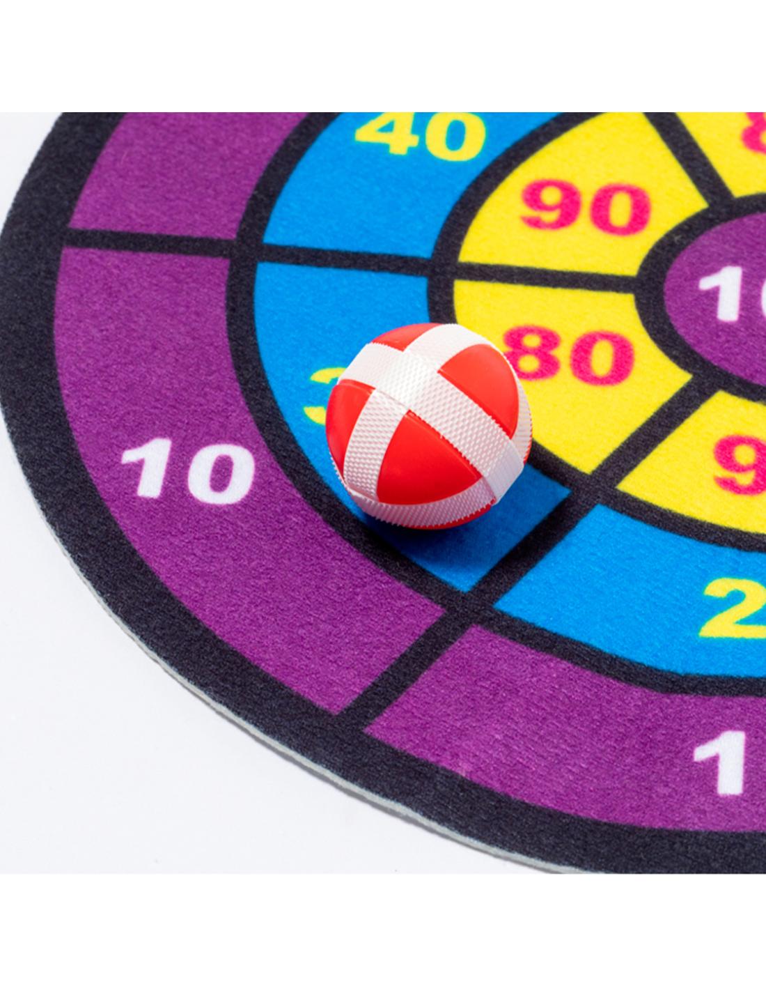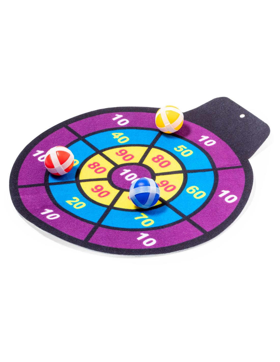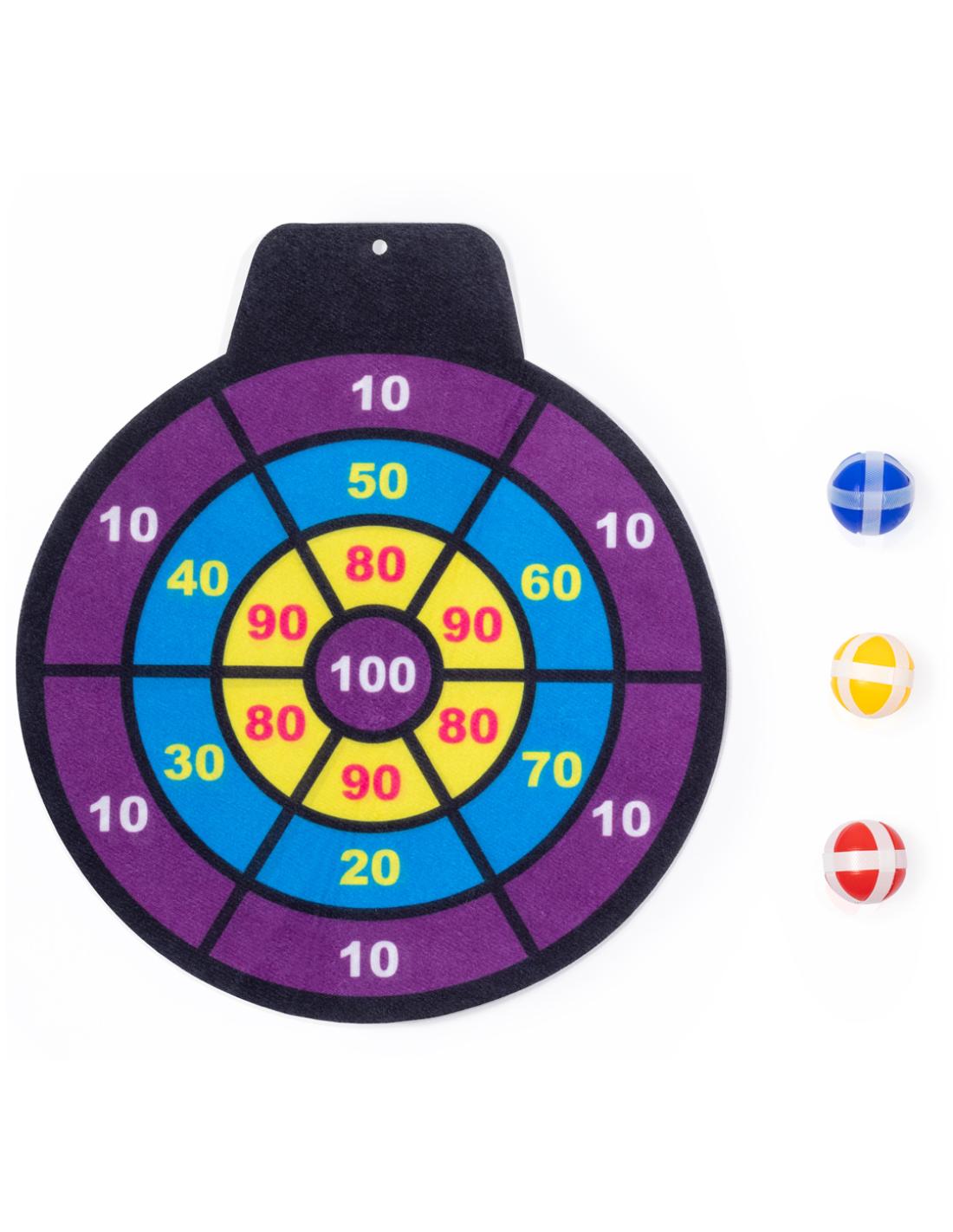 Divertida diana de tela con pelotas de velcro. Perfecta para todas las edades ofreciendo un objetivo desafiante y seguro. El juego consiste en lanzar a la diana con puntuaciónes las pelotas de distintos colores, que se quedarán fijas gracias a su envoltura de velcro. Fácil de colgar en cualquier sitio y a cualquier altura mediante agujero. Incluye diana de tela flexible y 3 pelotas con velcro. Presentado en bolsa reciclada.