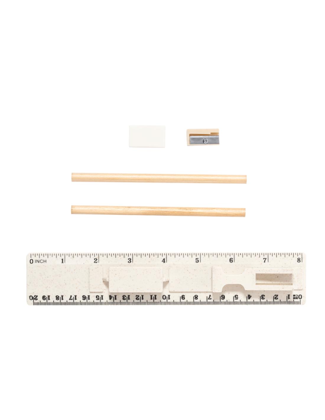 Set de 5 piezas fabricado en caña de trigo. Incluye 2 lápices de madera con mina negra y cuerpo cilíndrico blanco; goma y sacapuntas. Presentado en estuche/regla de 20 cm/8 pulgadas, con compartimentos para los distintos elementos del set. Presentado individualmente en una bolsa de papel blanca. La caña de trigo fomenta la utilización de materias primas naturales, reduciendo así las emisiones contaminantes.