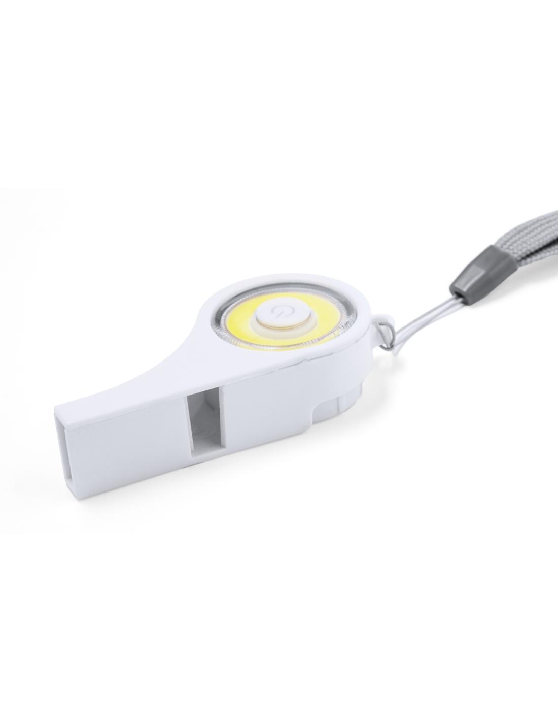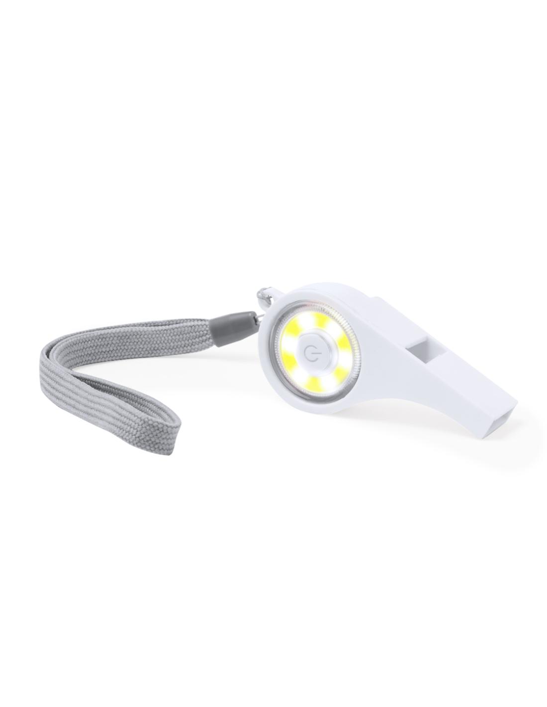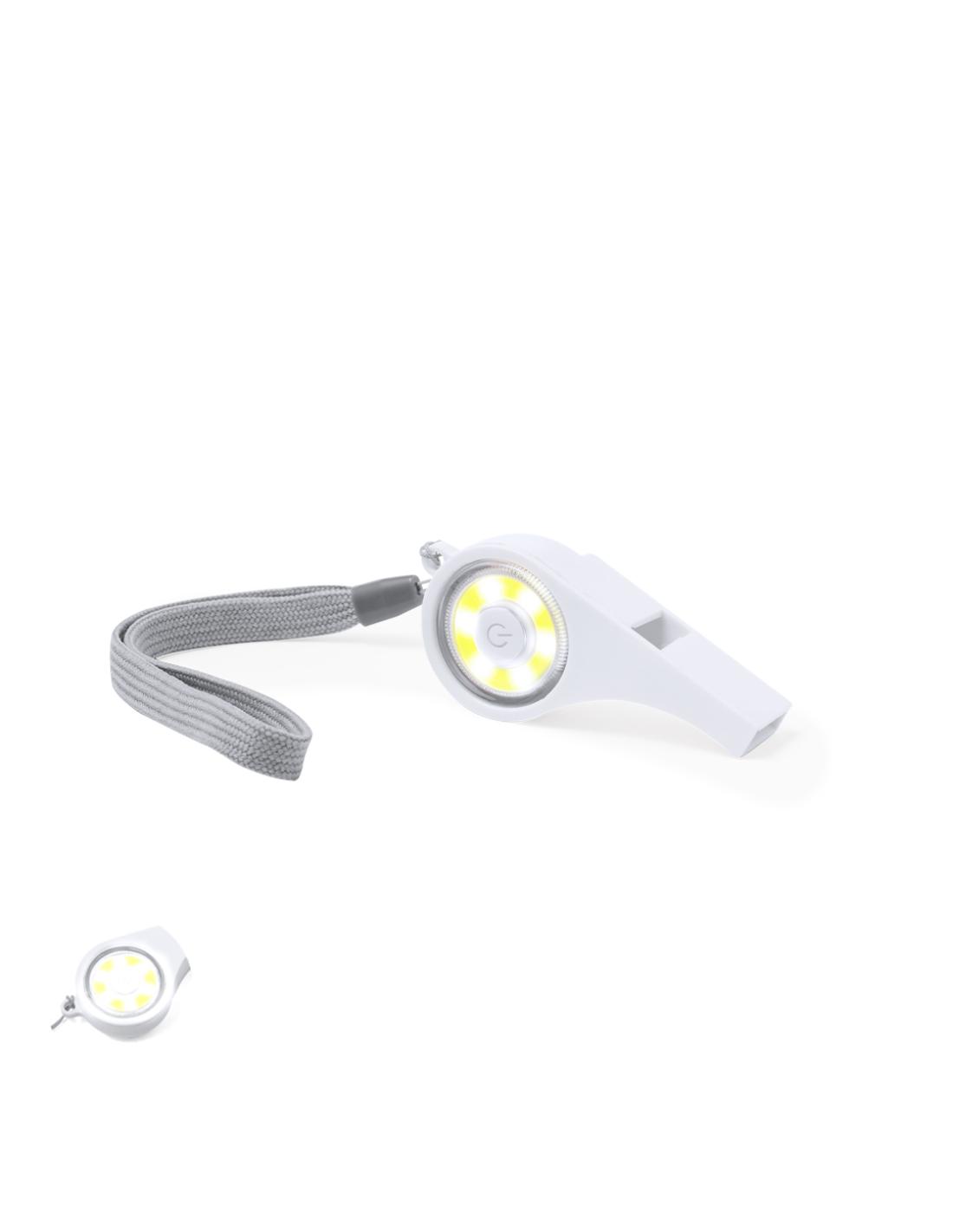 Ingenioso silbato multiusos con luz integrada en el cuerpo. Fabricado en resistente ABS, con 6 luces COB y varias posiciones de iluminación: fija con dos niveles de intensidad e intermitente para una mayor visibilidad. Cordón para un cómodo transporte y está alimentado por una pila de botón (incluida). Presentado en caja de diseño kraft.