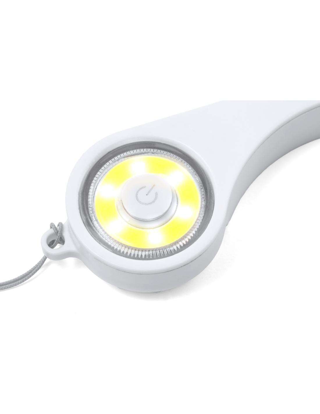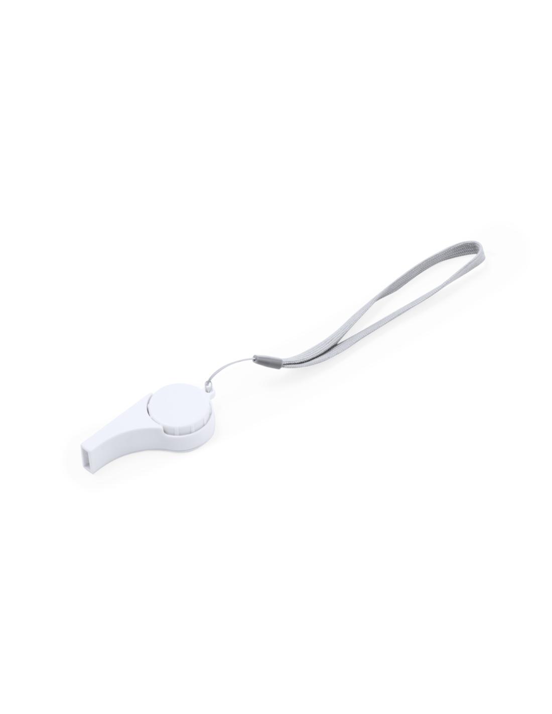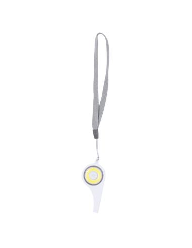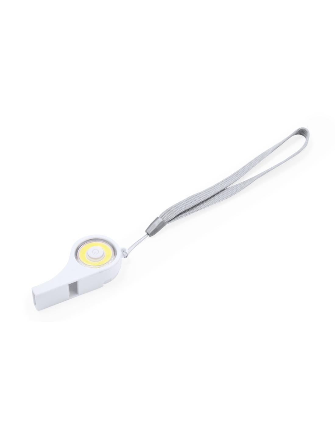 Ingenioso silbato multiusos con luz integrada en el cuerpo. Fabricado en resistente ABS, con 6 luces COB y varias posiciones de iluminación: fija con dos niveles de intensidad e intermitente para una mayor visibilidad. Cordón para un cómodo transporte y está alimentado por una pila de botón (incluida). Presentado en caja de diseño kraft.