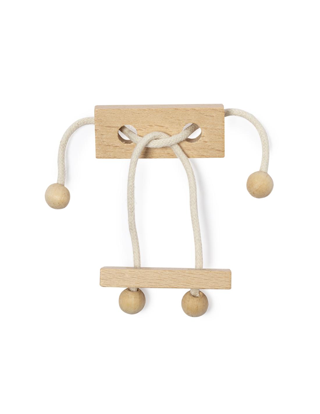 Juego de habilidad de 2 piezas fabricado en madera. Divertido rompecabezas de dos piezas unidas por un cordón de madera, cuyo objetivo es descubrir la forma de separar ambas piezas. Presentado individualmente en una caja de diseño kraft.