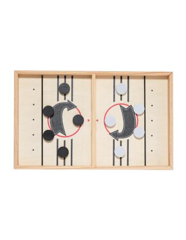 Divertido juego de mesa fabricado en madera e ideal para los más competitivos. El juego consiste en lanzar las fichas desde cada campo al capo contrario usando el elástico. Gana el que más fichas cuele por la ranura del oponente. Tablero con 5 fichas blancas y 5 negras, presentado en una caja individual de diseño kraft.