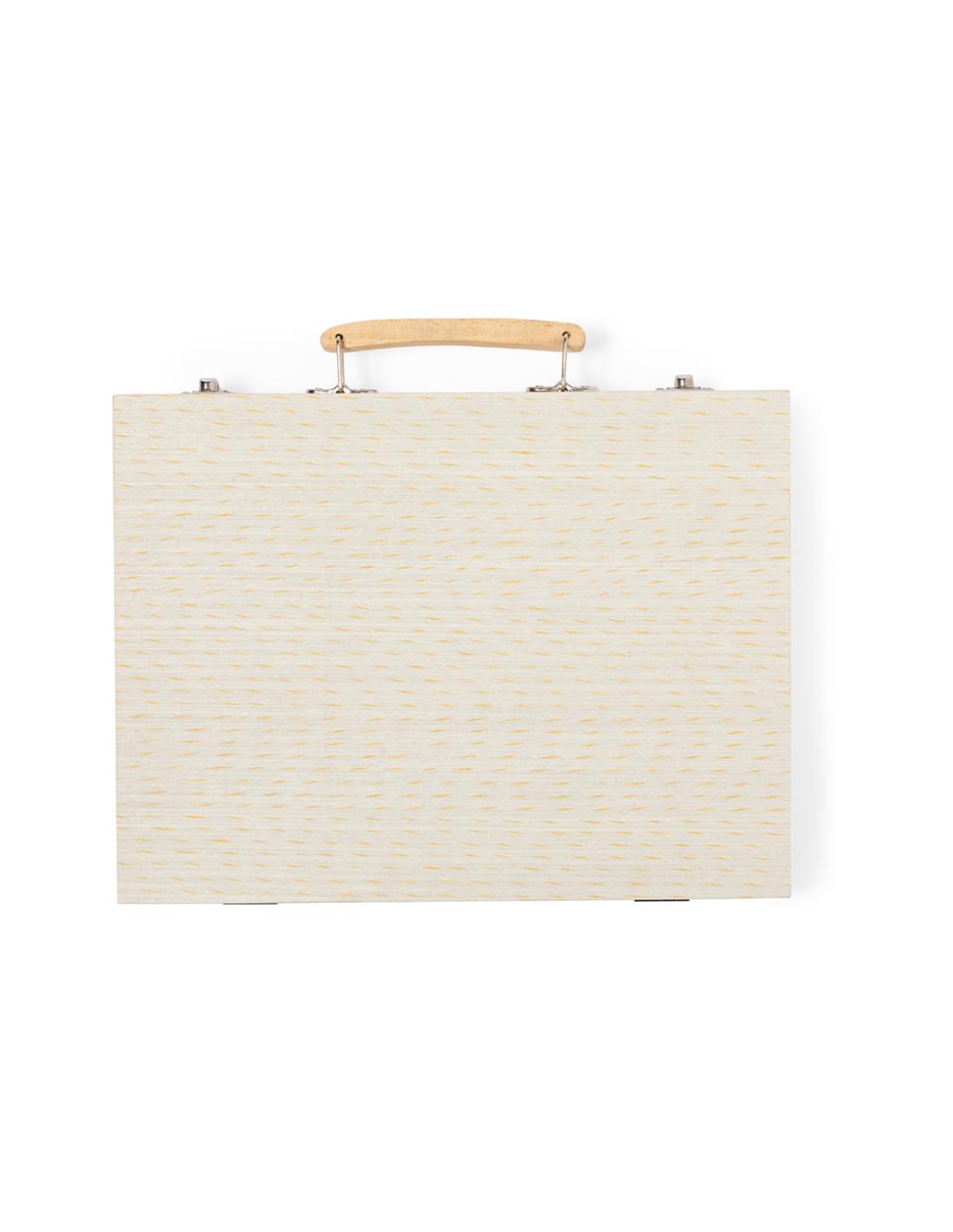 Completo maletín para colorear fabricado en madera, con cómoda asa de transporte. Contenido: - 12 rotuladores- 12 lápices- 12 ceras crayón - 12 ceras al aceite - Placa de acuarelas con pincel y paleta - Sacapuntas- Goma- Tarro de pegamento- Regla