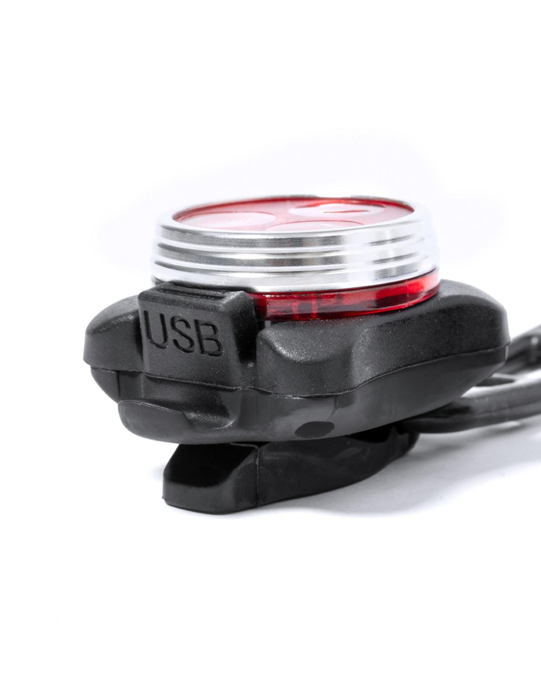 Kit de luces de seguridad para bicicleta fabricadas en silicona y ABS. Este conjunto consta de dos piezas: una luz blanca para el frontal y otra luz roja para la parte trasera, mejorando la visibilidad. Equipadas con tres potentes LEDs, que ofrecen 4 modos de iluminación: fijo de intensidad alta o media, e intermitente rápido o lento. Recargable gracias a su batería de 650 mAh de capacidad, con cable de carga incluido. Con accesorios de acople válidos para cualquier bicicleta y presentado en caja de diseño kraft.