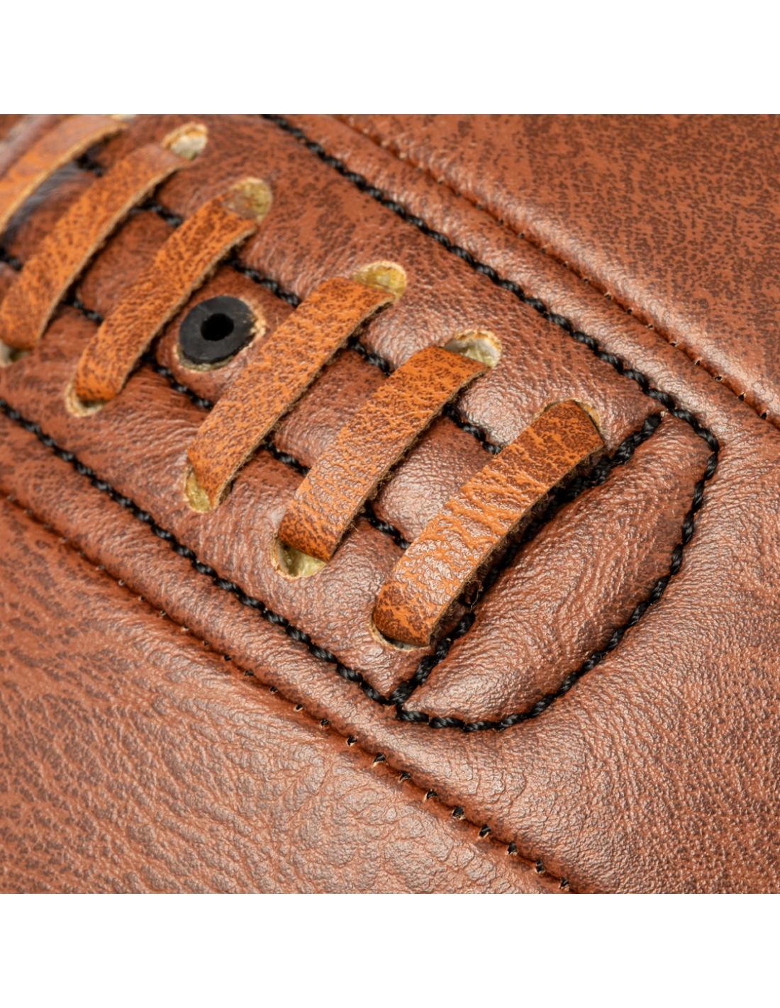 Balón de futbol de diseño retro fabricado en resistente polipiel. Con diseño inspirado en los antiguos balones de cuero y válvula reforzada con un cordón en el mismo material. Ideal para exposición o para disfrutar del juego. Presentación desinflado y en bolsa individual reciclada.