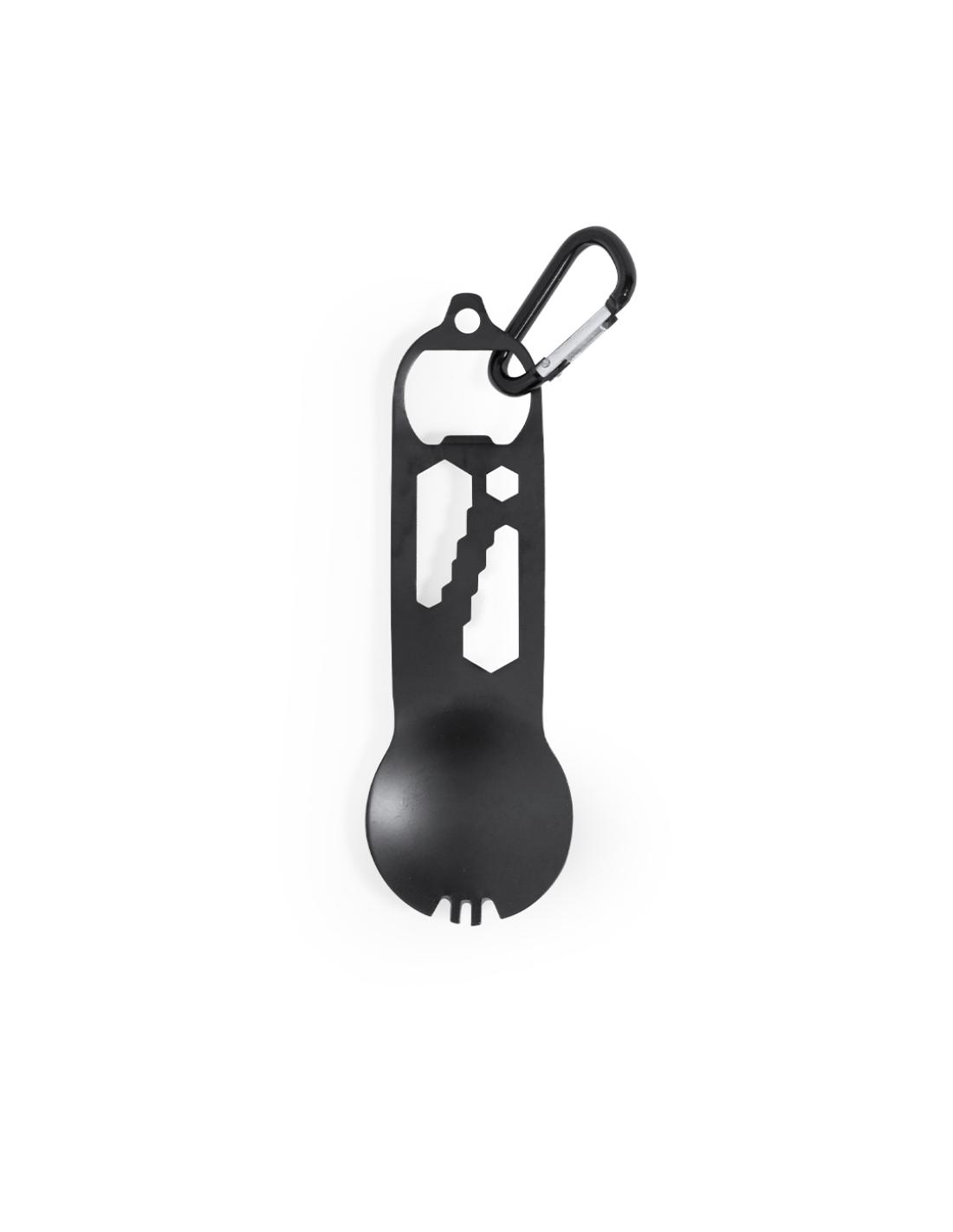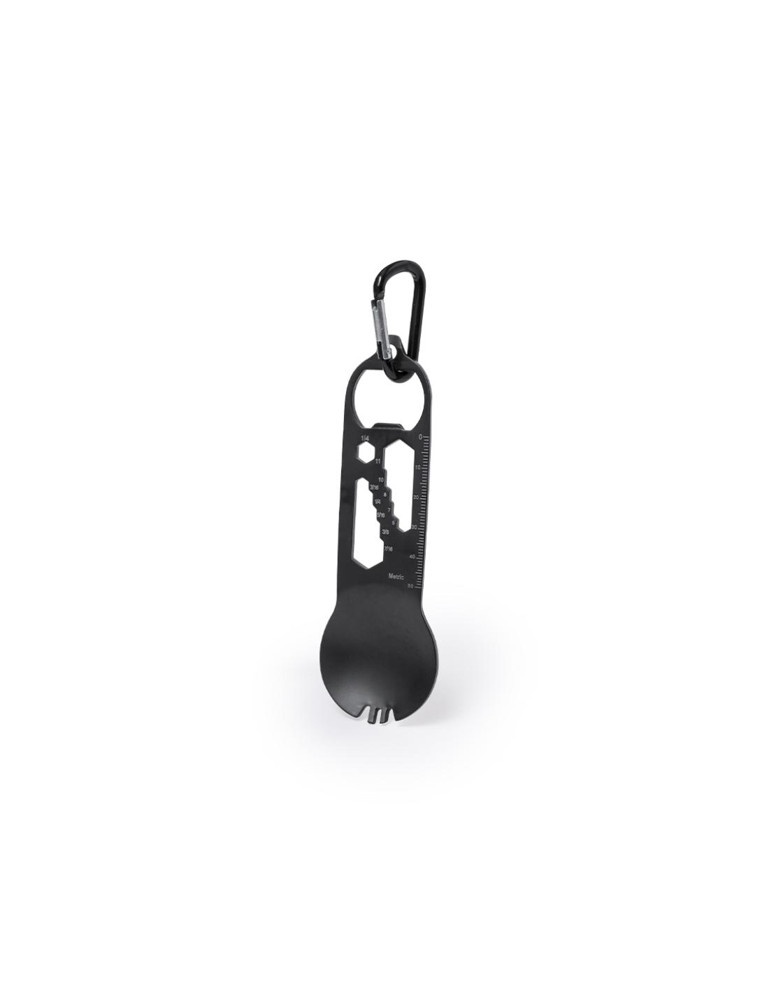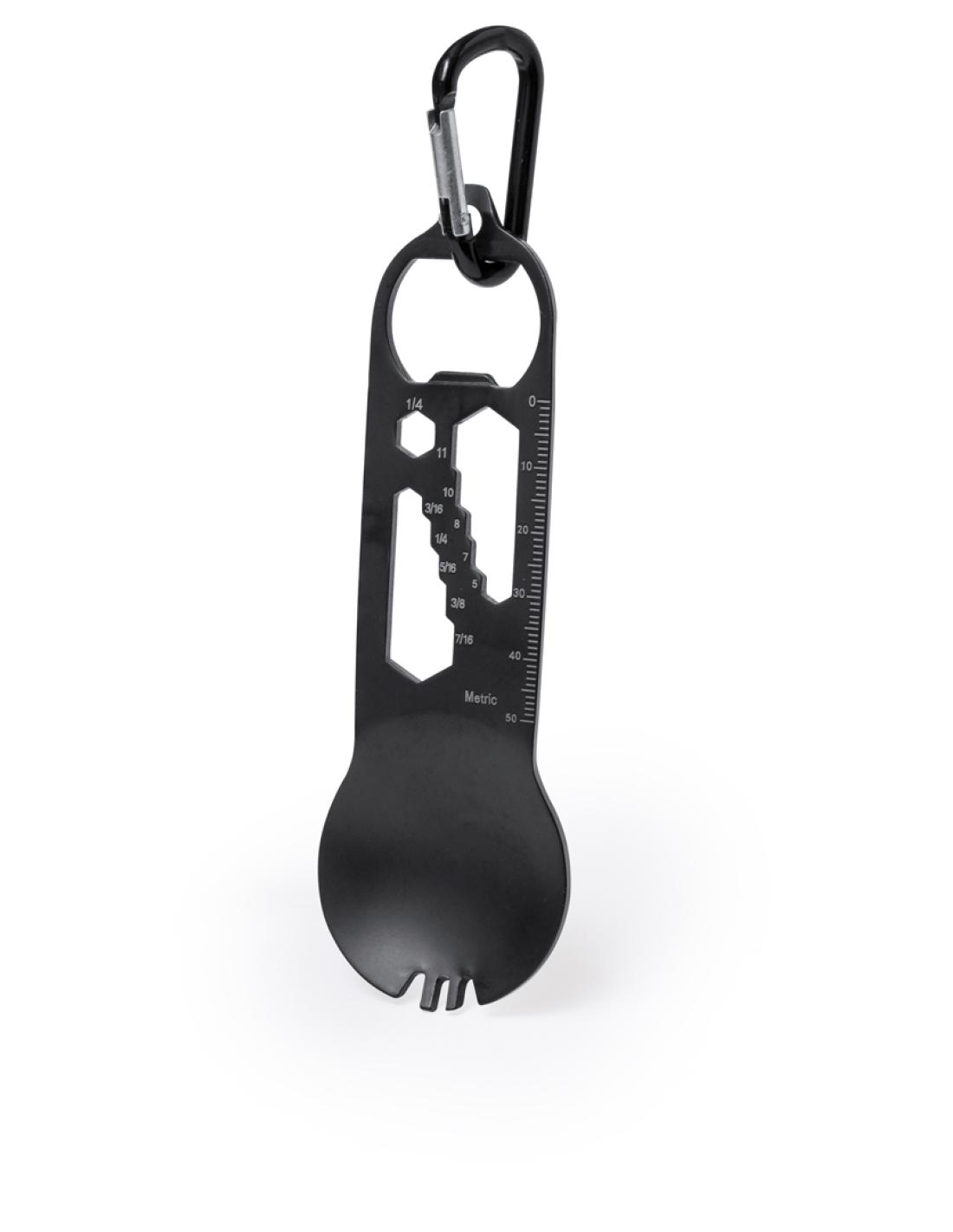 Completa multiherramienta con 16 funciones en acero inox. Incluye: mosquetón para transportarlo fácilmente, zona plana función destornillador, abrebotellas, regla de hasta 5 cm en un lateral, parte central para tuercas de 11 medidas diferentes (desde 1/4 hasta 11) y práctica cuchara con dientes para uso de tenedor. Presentada en una bolsa individual.