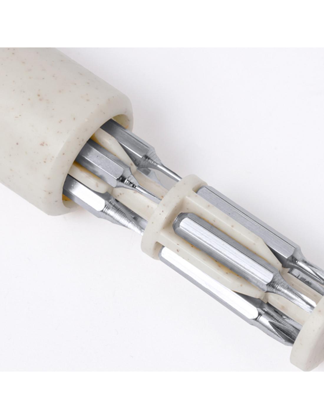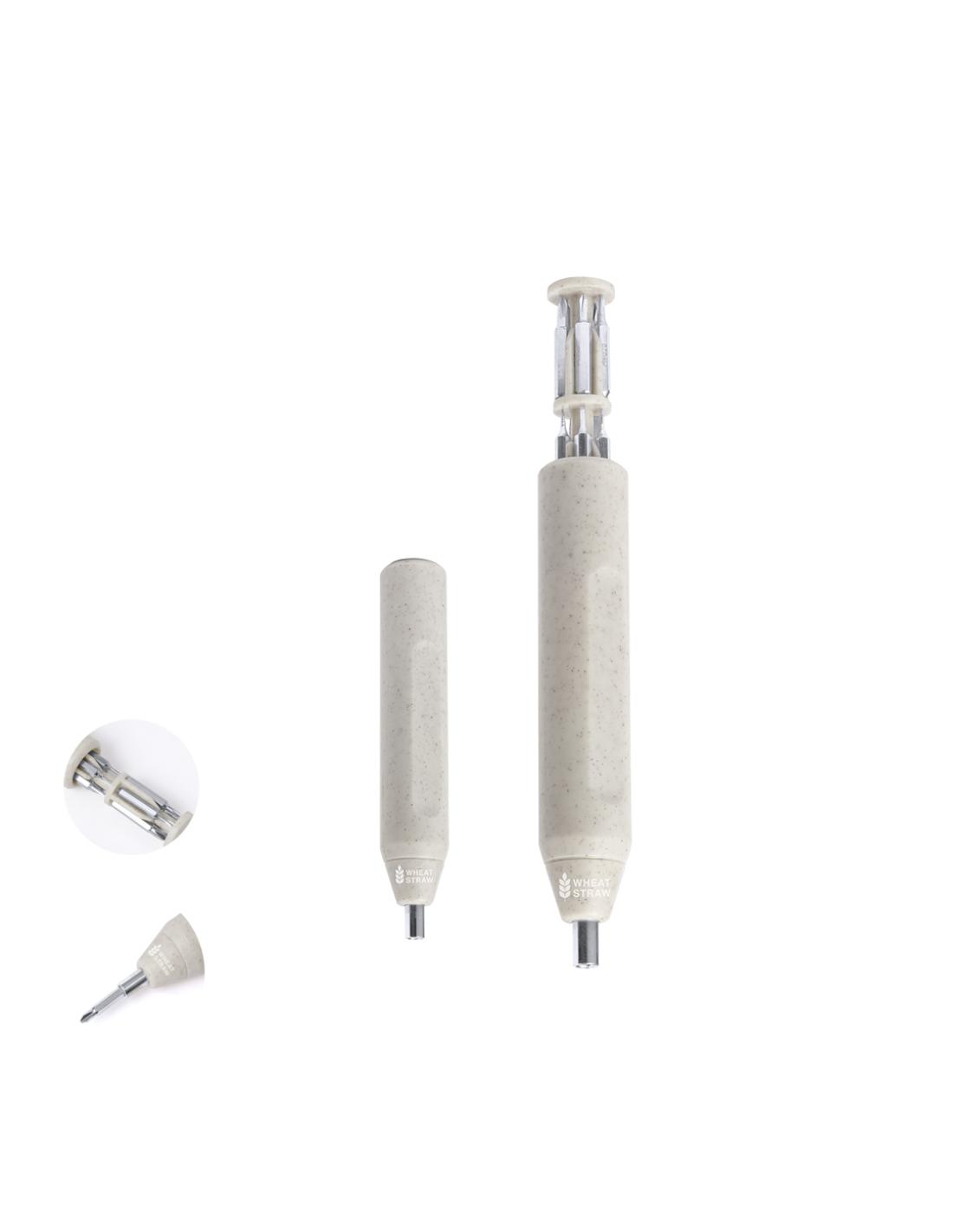 Práctica multiherramienta fabricada en caña de trigo con forma de destornillador. Incluye un compartimento en la empuñadura para guardar las múltiples puntas magenéticas (planas y philips). Con logotipo caña de trigo incluido. Presentada en caja de diseño kraft. La caña de trigo fomenta la utilización de materias primas naturales, reduciendo así las emisiones contaminantes.
