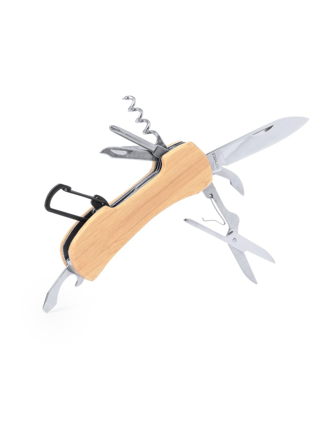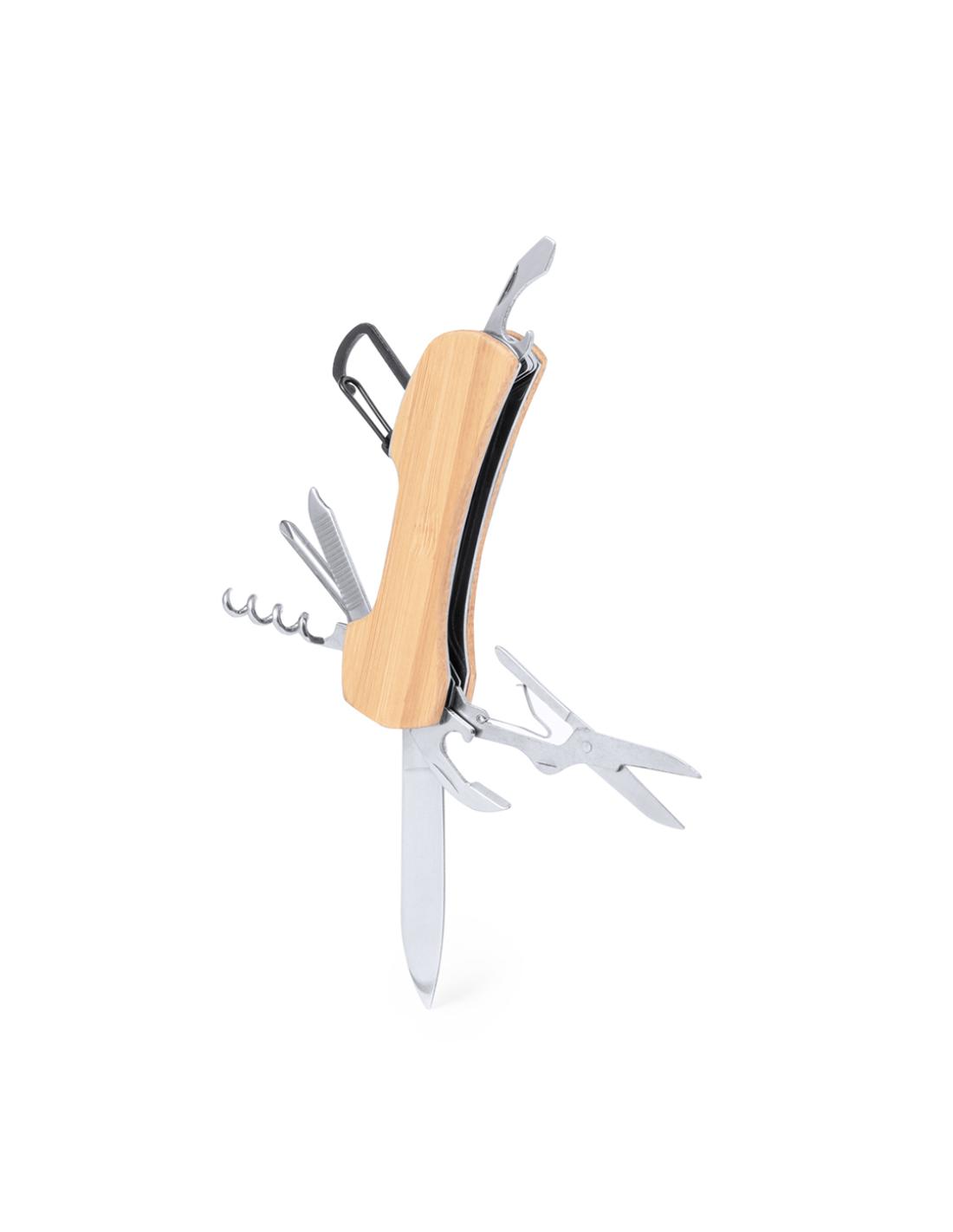 Navaja multiusos fabricada en acero inox y suave bambú. Con 9 funciones que incluyen cuchillo, tijeras, abrelatas, sacacorchos, destornillador philips, destornillador plano, lima y abrebotellas. Además, cuenta con un práctico enganche en forma de mosquetón. Presentada en caja de diseño kraft. Materiales como el bambú fomentan la utilización de materias primas naturales, reduciendo las emisiones contaminantes. Proviene de una planta de gran resistencia y versatilidad, con crecimiento y regeneración rápidos, siendo una excelente alternativa al uso de madera tradicional.