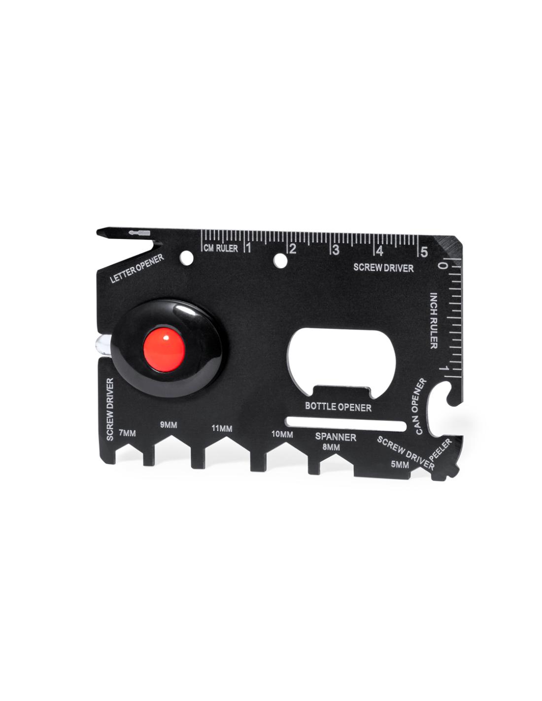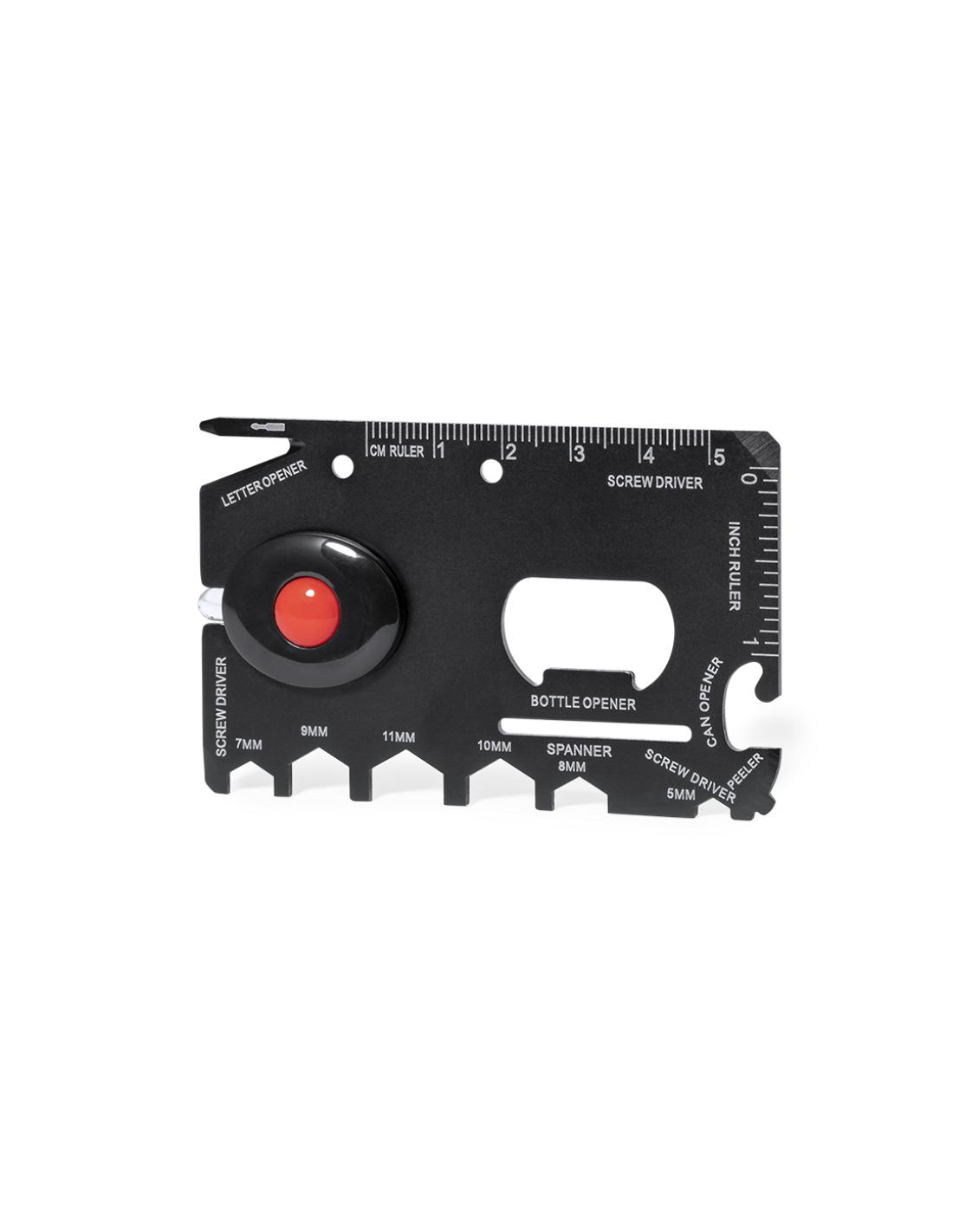 Práctica multiherramienta fabricada en acero inox y acabado en negro. Diseño plano en forma de tarjeta y con 16 funciones: destornilladores planos, abridor de cartas, regla en cm y pulgadas, abridor de botellas, abrelatas, pelador, llave para tuercas hexagonales en varios tamaños y linterna (pila de botón incluida). Presentada en bolsa individual diseño en papel reciclado.