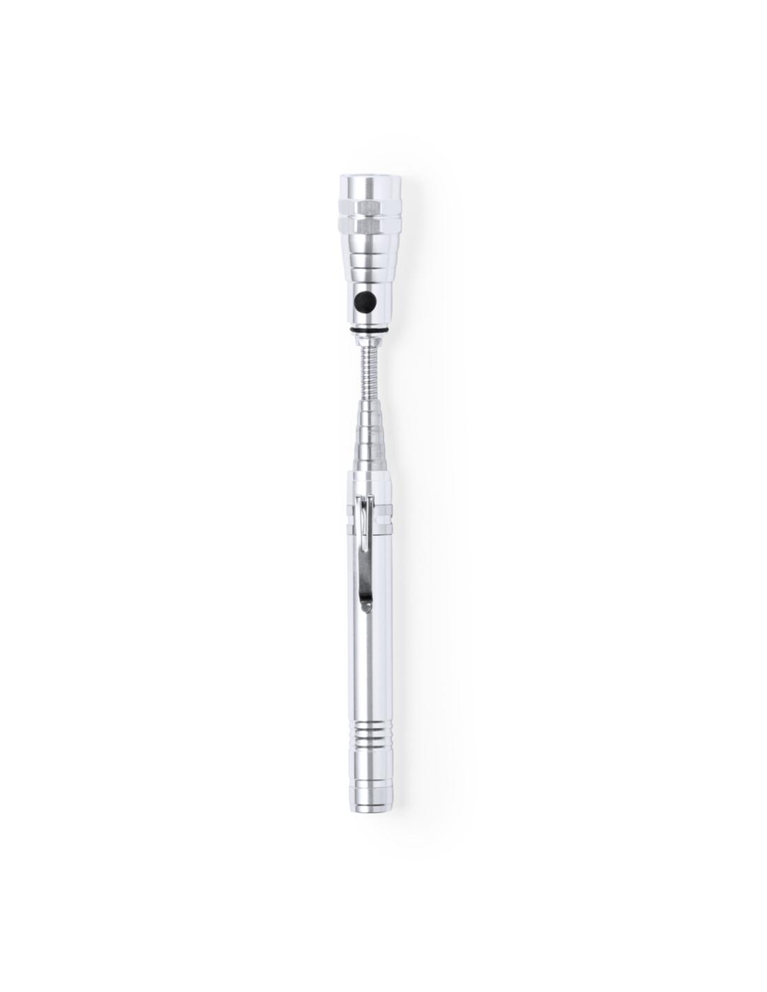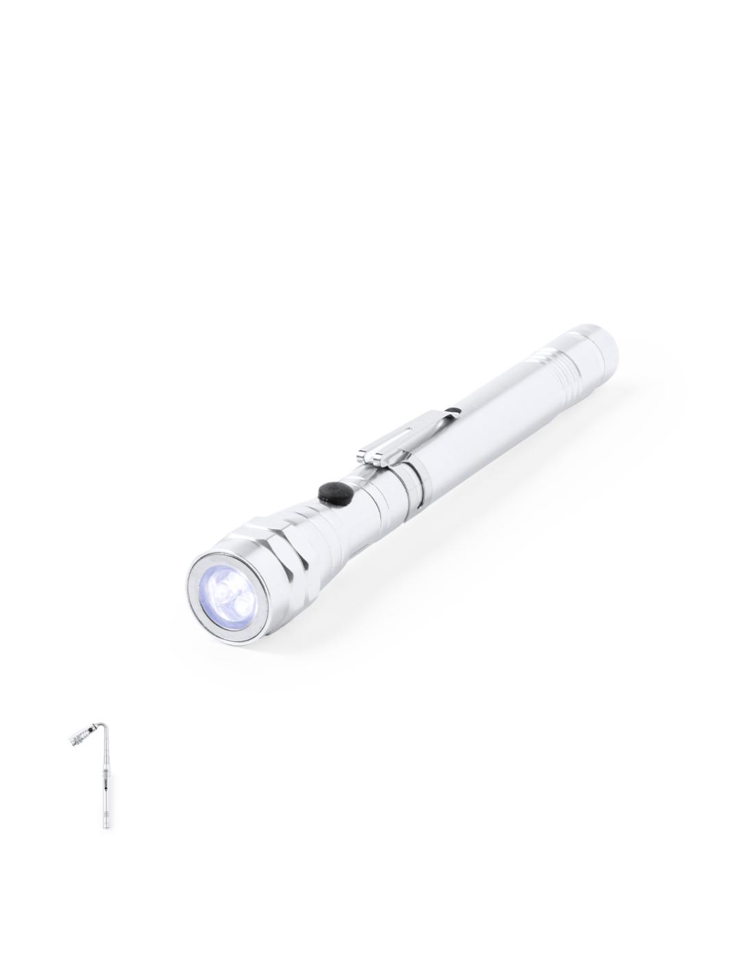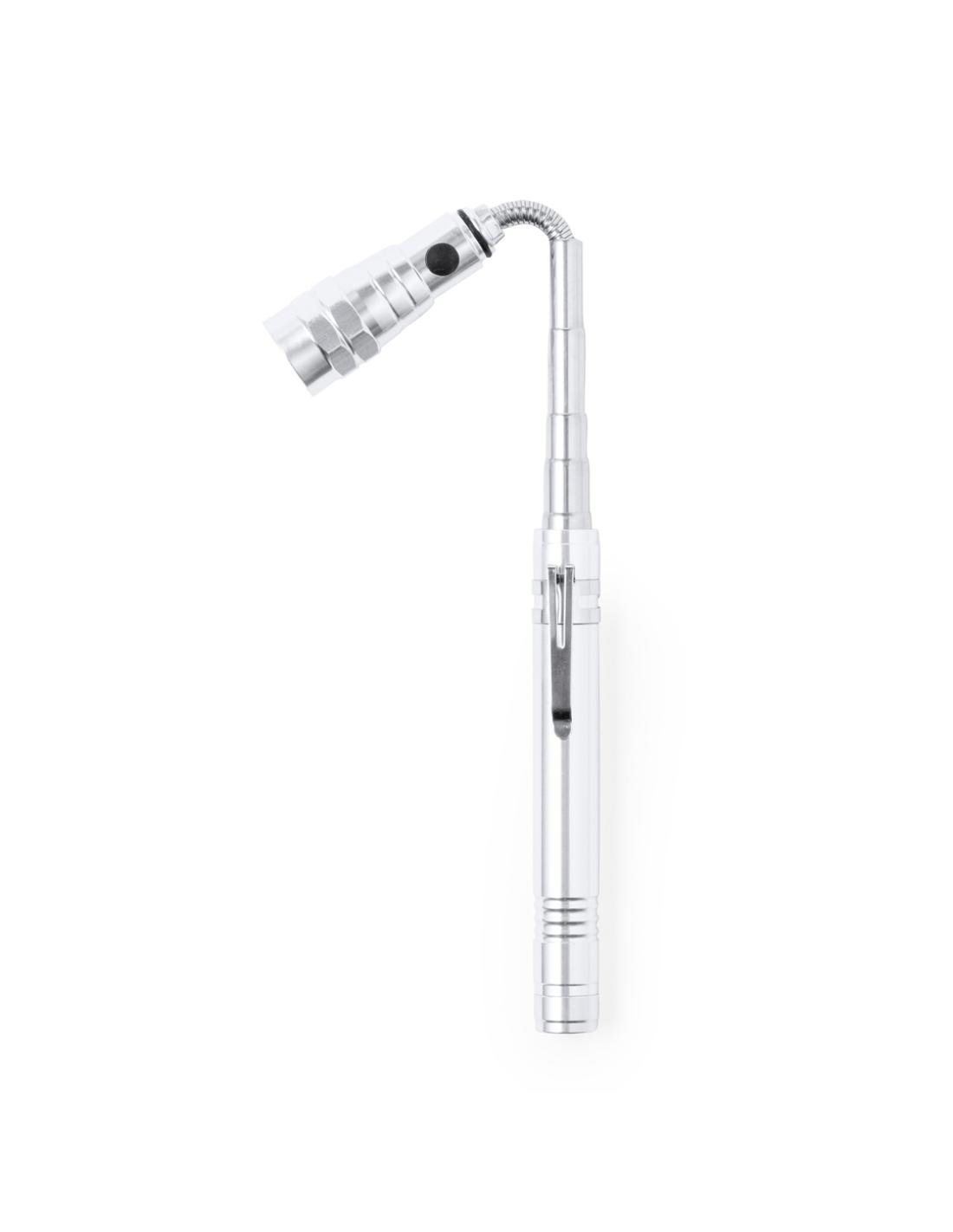 Linterna de aluminio práctica y versátil, con cabezal extensible (triplicando su longitud) y flexible para llegar a todos los lugares, además está equipado con imanes adaptándose a diversas necesidades. Cuenta con 3 potentes LEDs para una iluminación eficiente. Funciona con pilas de botón incluidas y presenta un clip metálico para facilitar su sujeción. Se presenta de manera individual en una caja de diseño kraft.