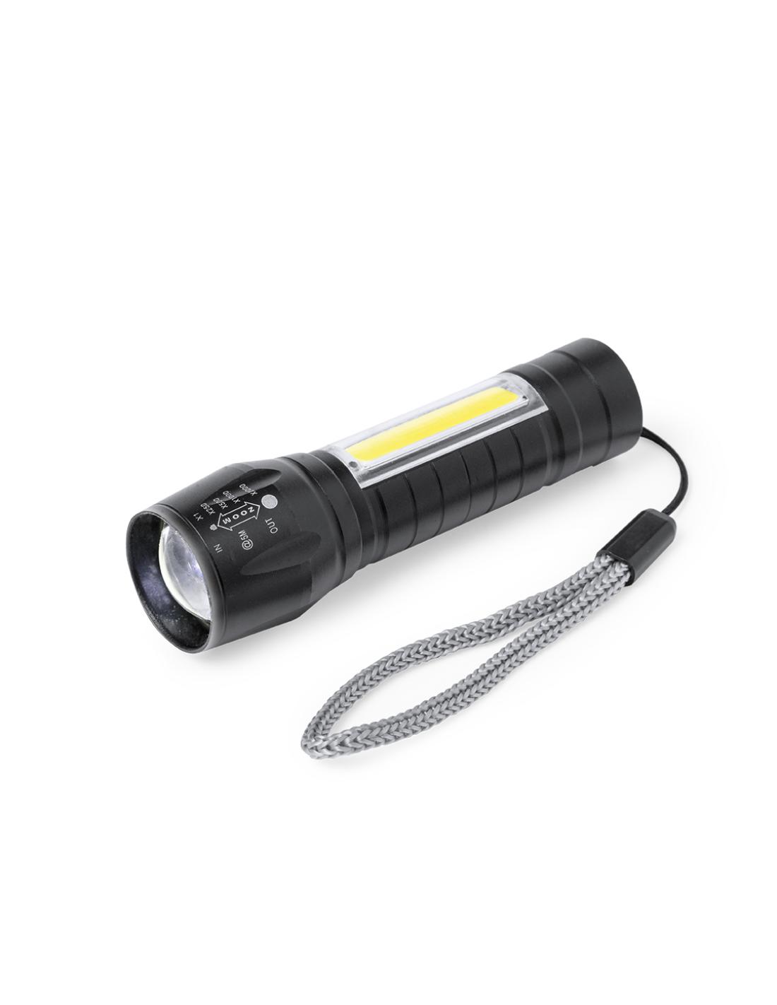 Potente linterna con batería recargable, fabricada en aluminio de acabado en color negro. Luz frontal con 1 LED y cabezal regulable, para tener un enfoque más focalizado o abierto. Además, cuenta con 10 luces COB en el mango y tres modos de iluminación (fija e intermitente de dos velocidades), incluye cinta de trasporte. Se alimenta mediante una batería recargable de 400 mAh, incluido cable micro USB. Presentada individualmente en caja de diseño.