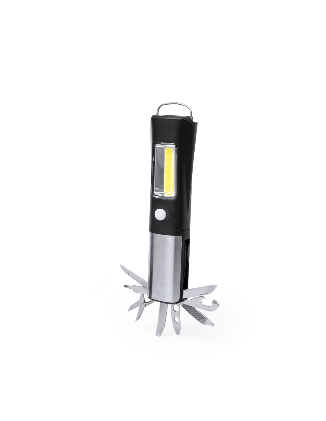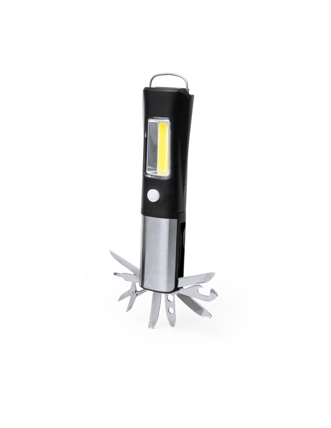 Práctica multiherramienta fabricada en resistente ABS y acero inox, con linterna frontal integrada de 1 LED. Incluye linterna lateral de 19 luces COB con dos posiciones de ilumincación (fija e intermitente). Dispone de 13 funciones, entre ellas cuchillo liso, de sierra, destornillador philips, tijeras, destornilladores planos, llave para tuercas hexagonales en varios tamaños, abrelatas, abrebotellas y una lima. Con imán de fijacion y asa. Alimentada con 3 pilas AAA, no incluidas. Presentada en caja de diseño kraft.