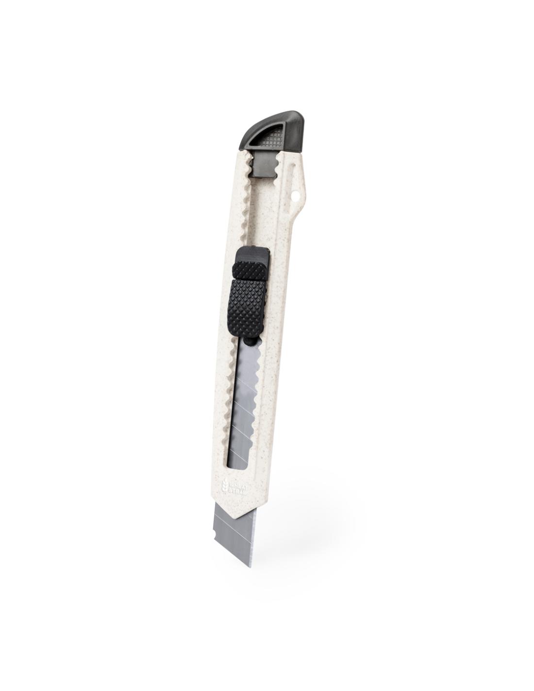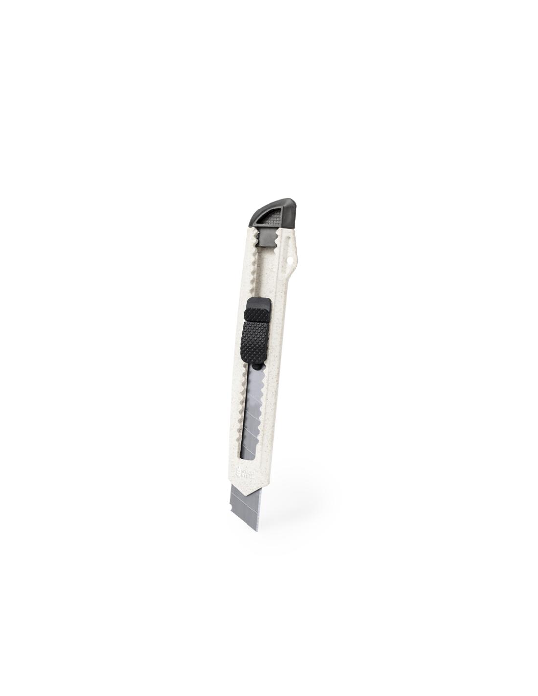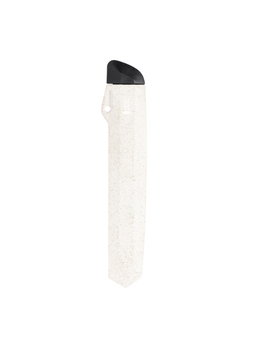 Cutter con cuchilla ancha fabricado en caña de trigo. Mango ergonómico troquelado con capucha extraíble para ajuste de corte de cuchilla, con mecanismo de bloqueo para mayor seguridad. Con logotipo caña de trigo incluido. Presentado individualmente en bolsa de papel reciclado. La caña de trigo fomenta la utilización de materias primas naturales, reduciendo así las emisiones contaminantes.