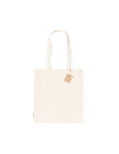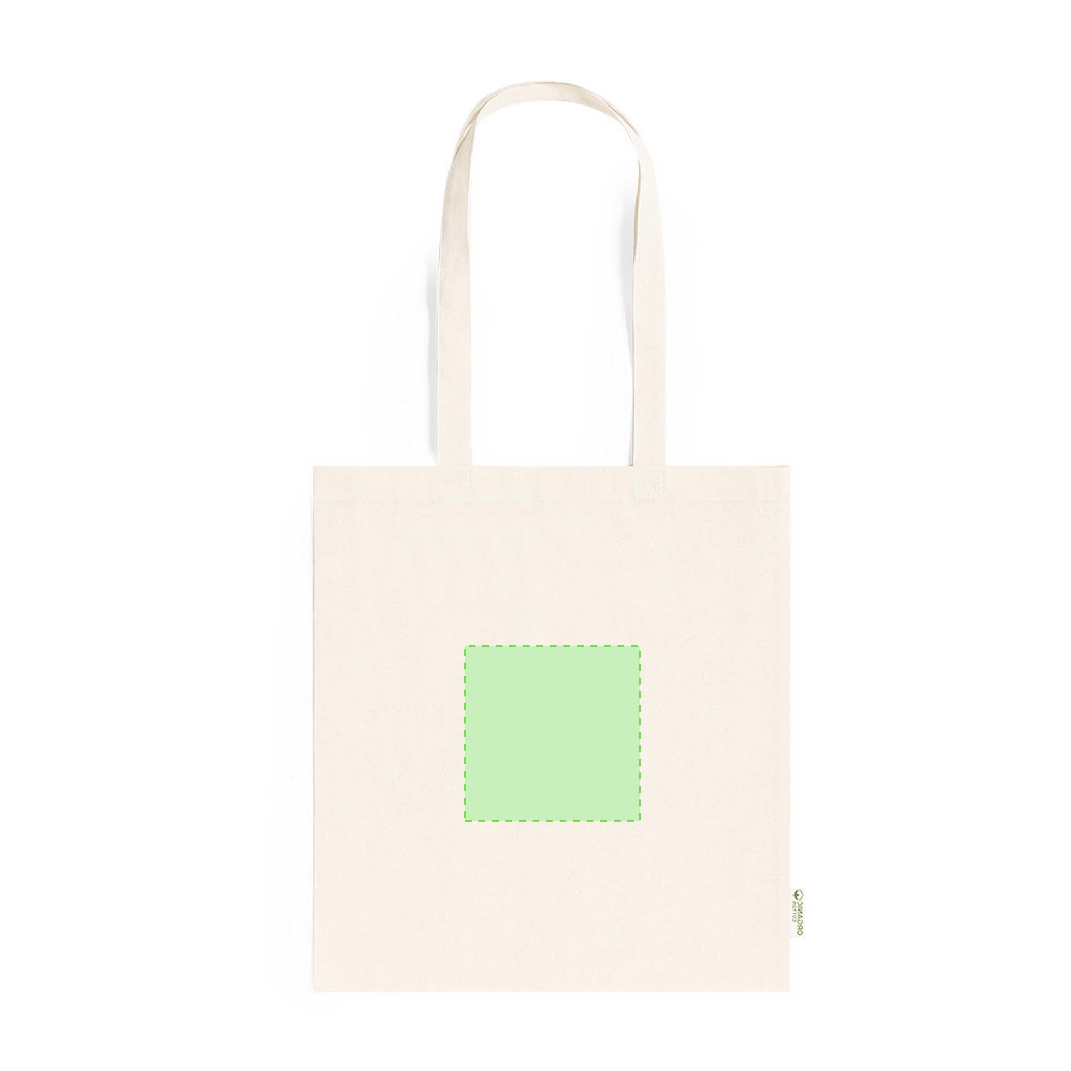 Bolsa fabricada en material100% algodón orgánico de 140g/m2 y en tono natural. De acabado cosido, con asas medianas reforzadas de 70 cm. Resistencia hasta 8kg, incluida etiqueta con distintivo de algodón orgánico y hangtag en cartón reciclado.