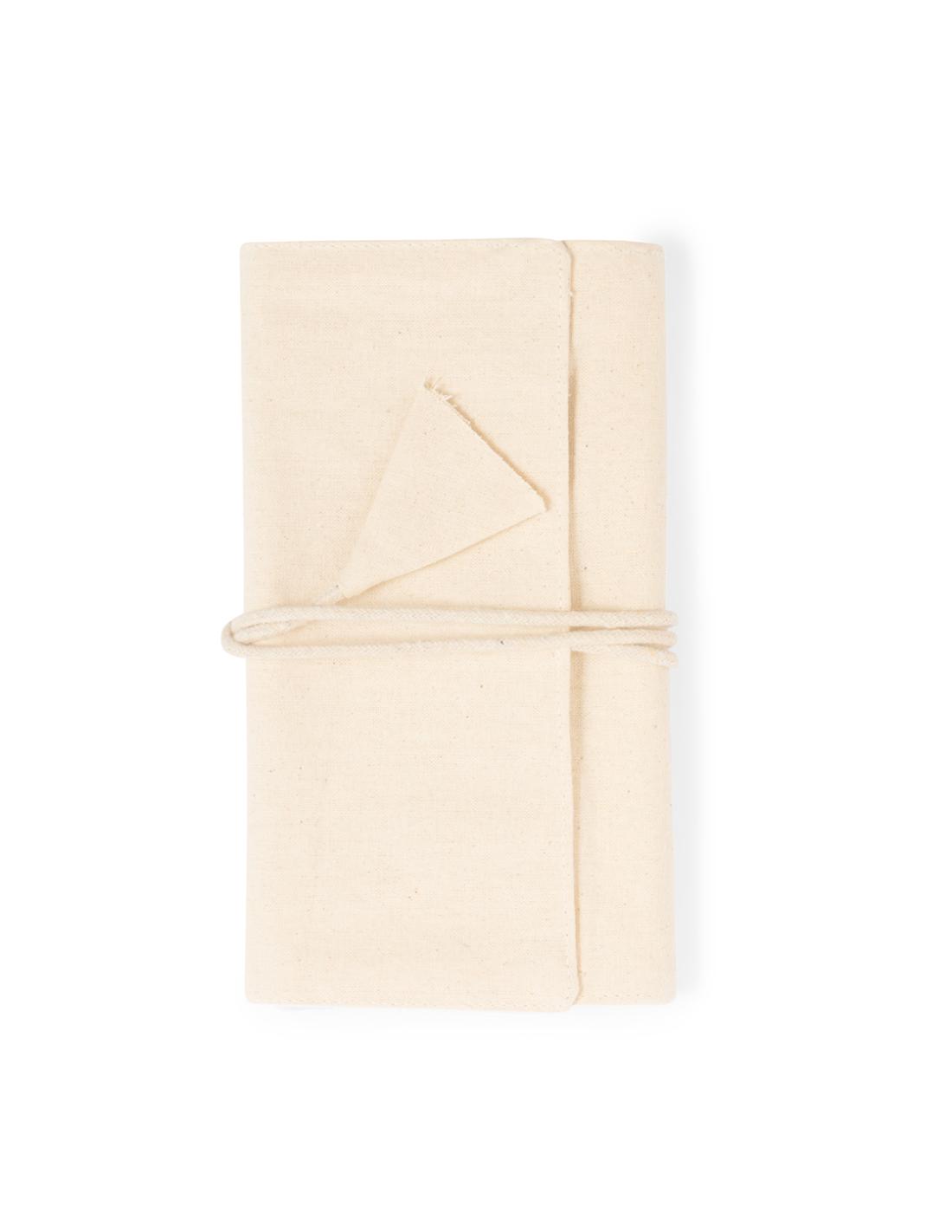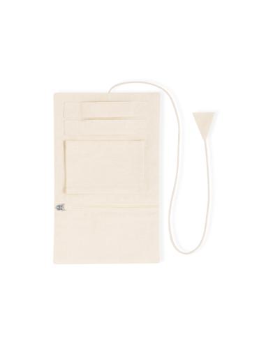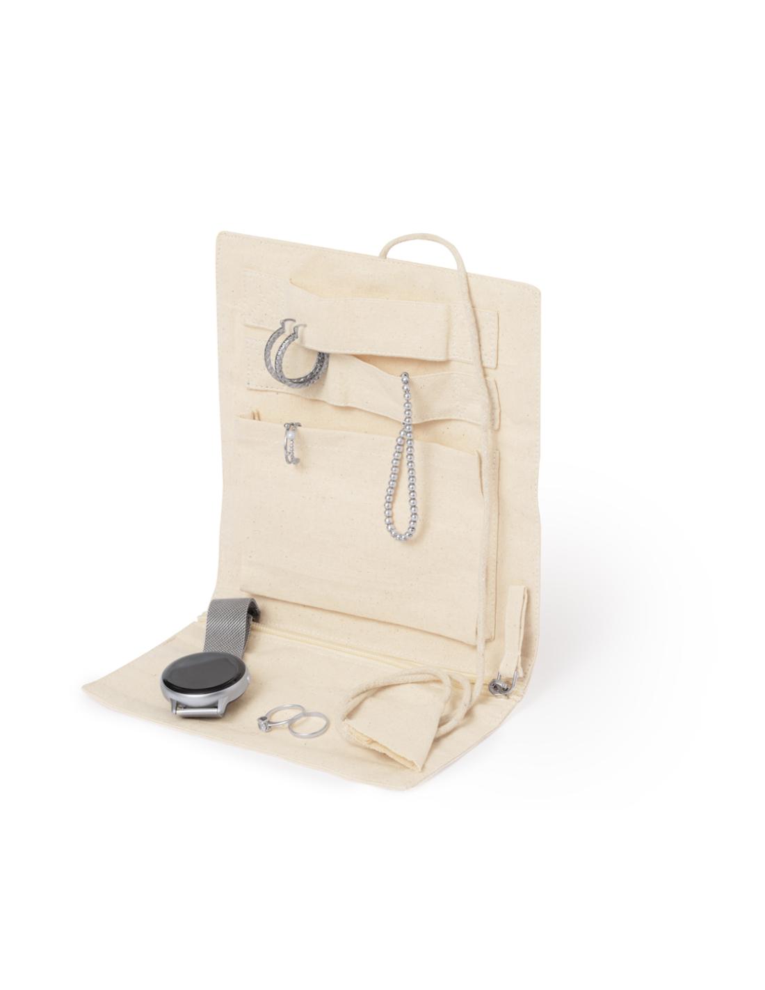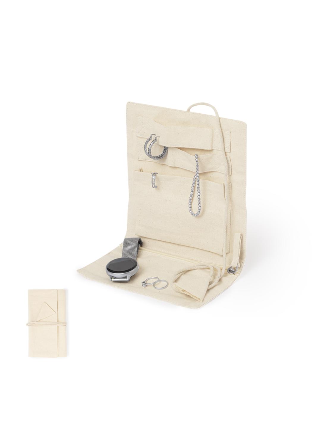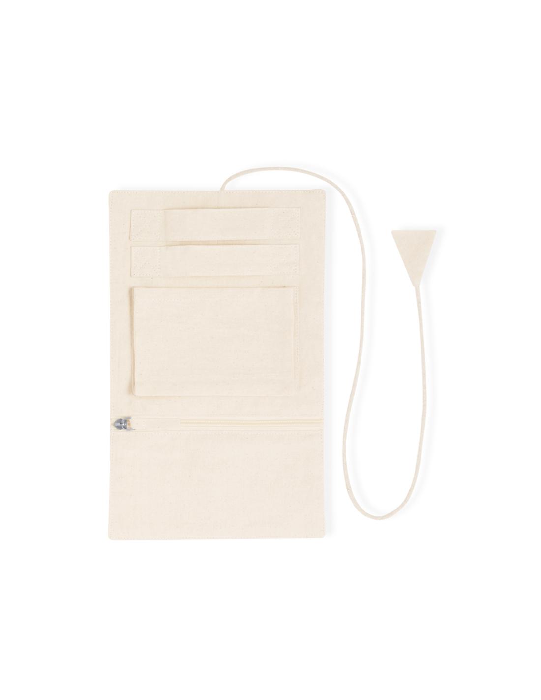 Joyero plegable fabricado en algodón, para guardar preciados artículos personales. Confeccionado en 3 partes de color natural: parte superior con cintas, parte central con bolsillo y parte inferior con bolsillo de cremallera, pudiendo plegarlo y sujetarlo firmemente con su cordón a juego.