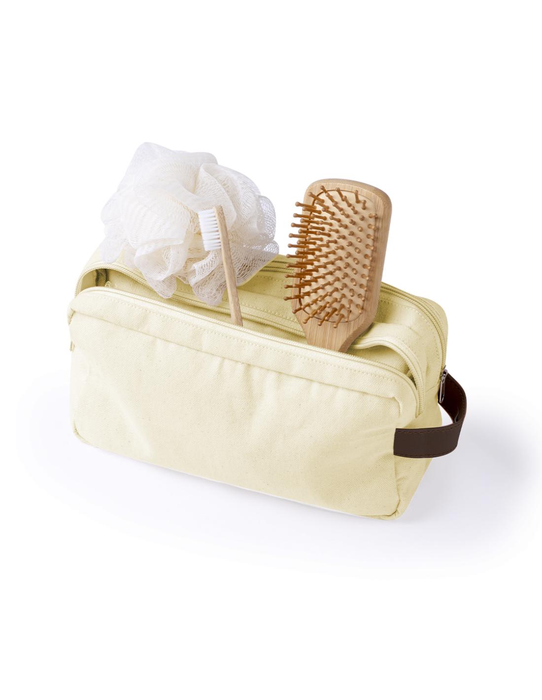 Neceser de doble compartimento fabricado en resistente canvas. Con cierre de cremallera, tiradores y asa en polipiel marrón. Disponible en elegantes colores.
