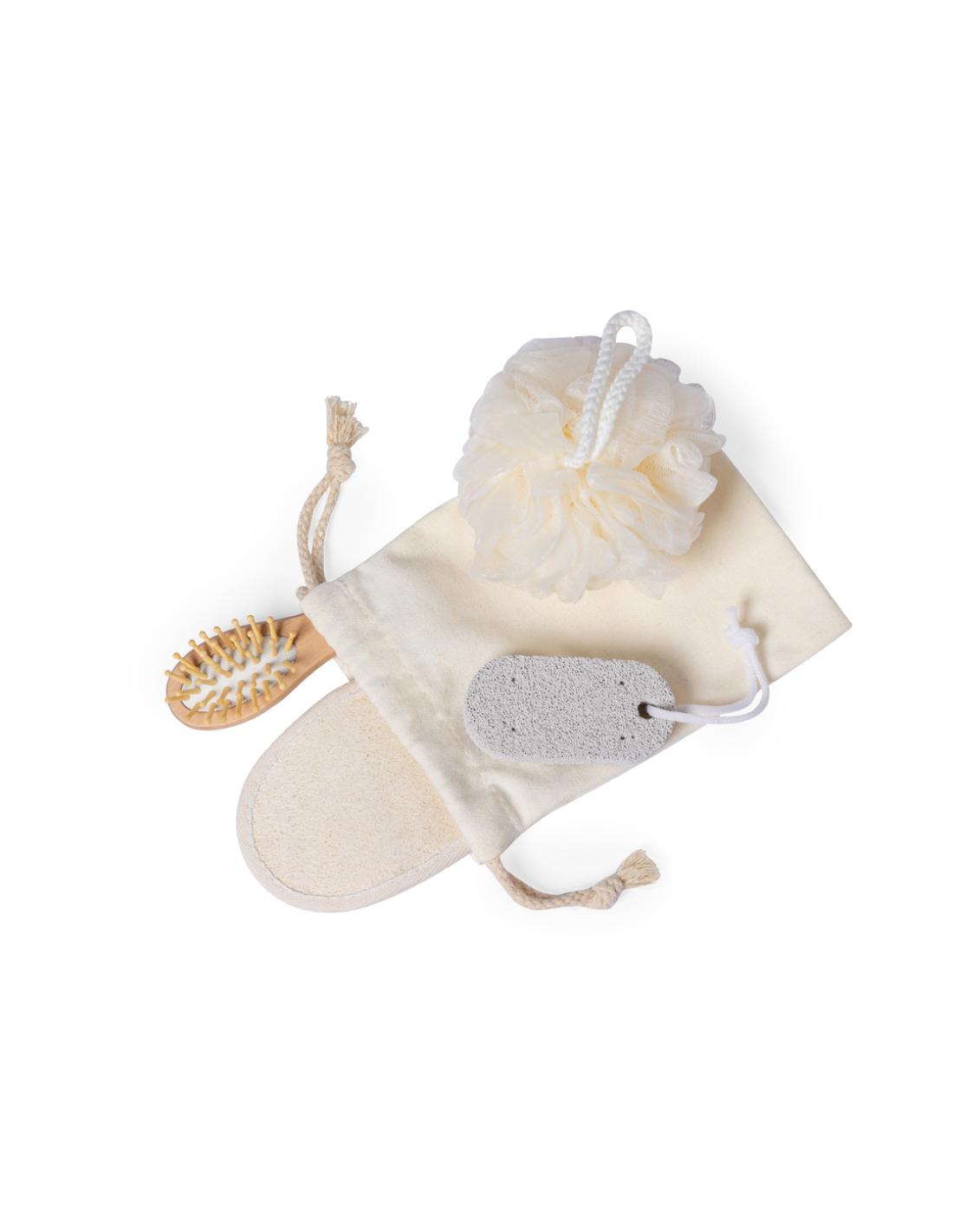 Completo set de baño con 4 accesorios. Practica bolsa de algodón de autocierre que incluye: cepillo para pelo fabricado en suave madera con cerdas a juego, suave esponja, esponja exfoliante adaptable a la palma de la mano y piedra pómez.
