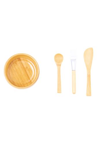 Completo set de mascarilla fabricado en bambú, ideal para una correcta aplicación de la mascarilla facial . Compuesto por 4 piezas: cuenco de elegante diseño, cuchara, paleta y brocha de suaves cerdas. Fácil de limpiar y presentado individualmente en caja de diseño kraft.