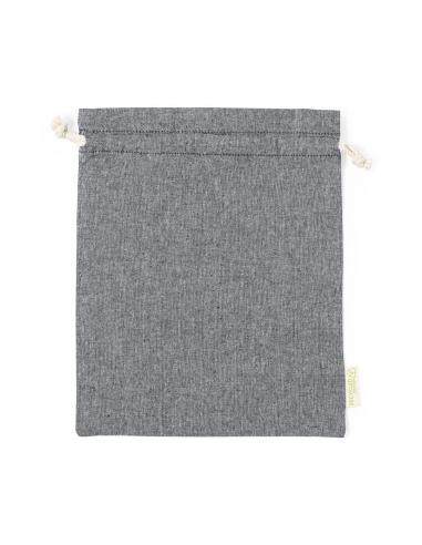 Bolsa eco-friendly en resistente material 100% algodón reciclado GRS de 120g/m2. Certificación GRS (Global Recycled Standard / Estándar de Reciclaje Global), que garantiza el origen reciclado del material usado para fabricar el producto. Cierre de cordón de algodón y acabado cosido, incluye etiqueta exterior con distintivo algodón reciclado.
