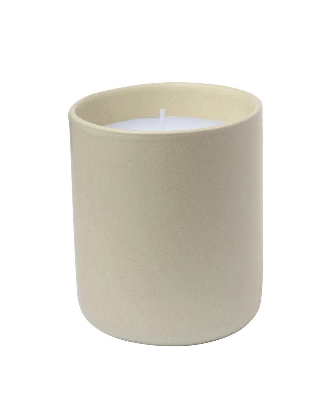 Vela aromática en tarro de cerámica con aroma a vainilla. Disponible en cristal de elegantes colores de tonos naturales. Presentada en caja individual diseño kraft.