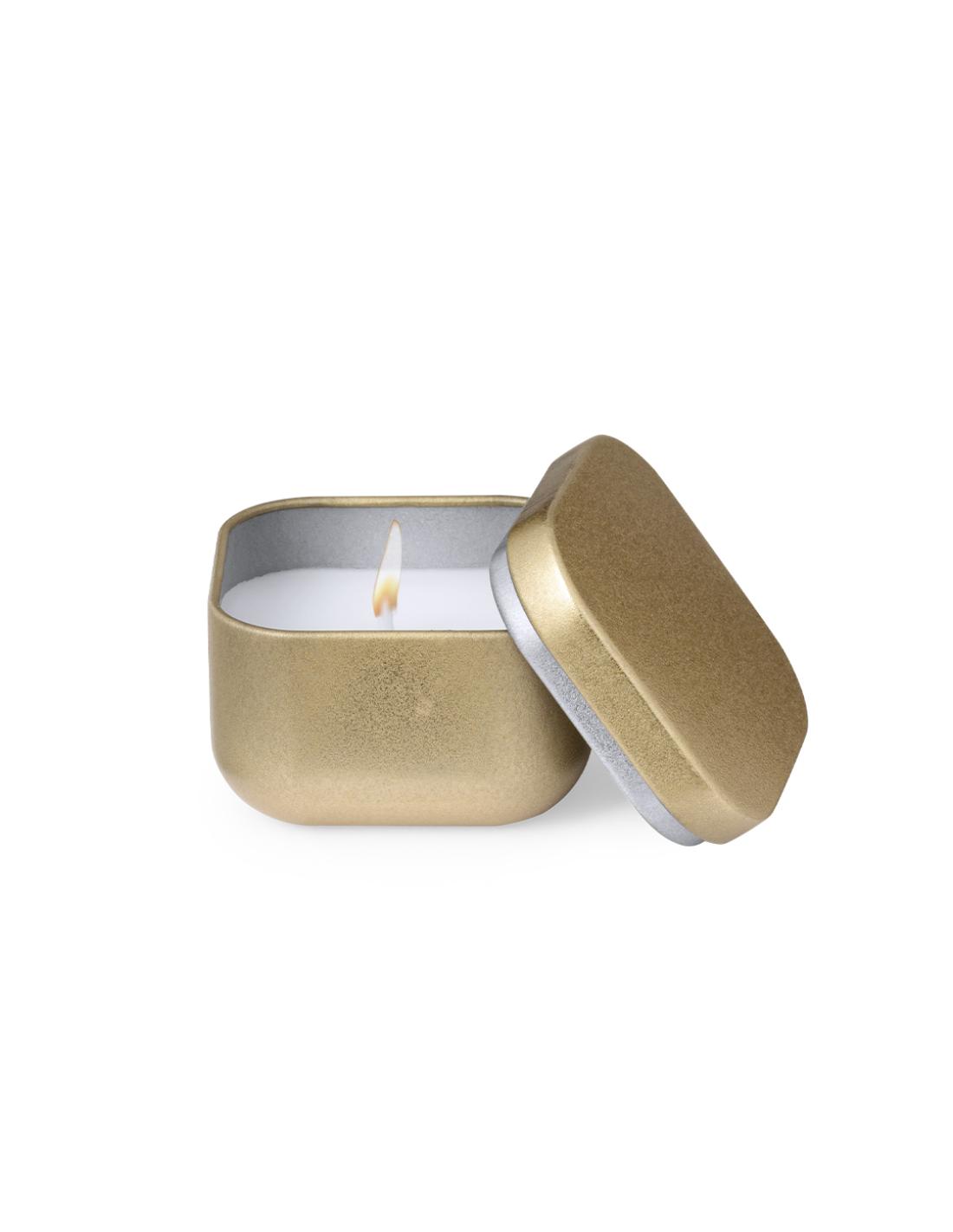Vela aromática en tarro de metal en elegantes colores, con aroma a vainilla. Presentada en caja individual diseño kraft.