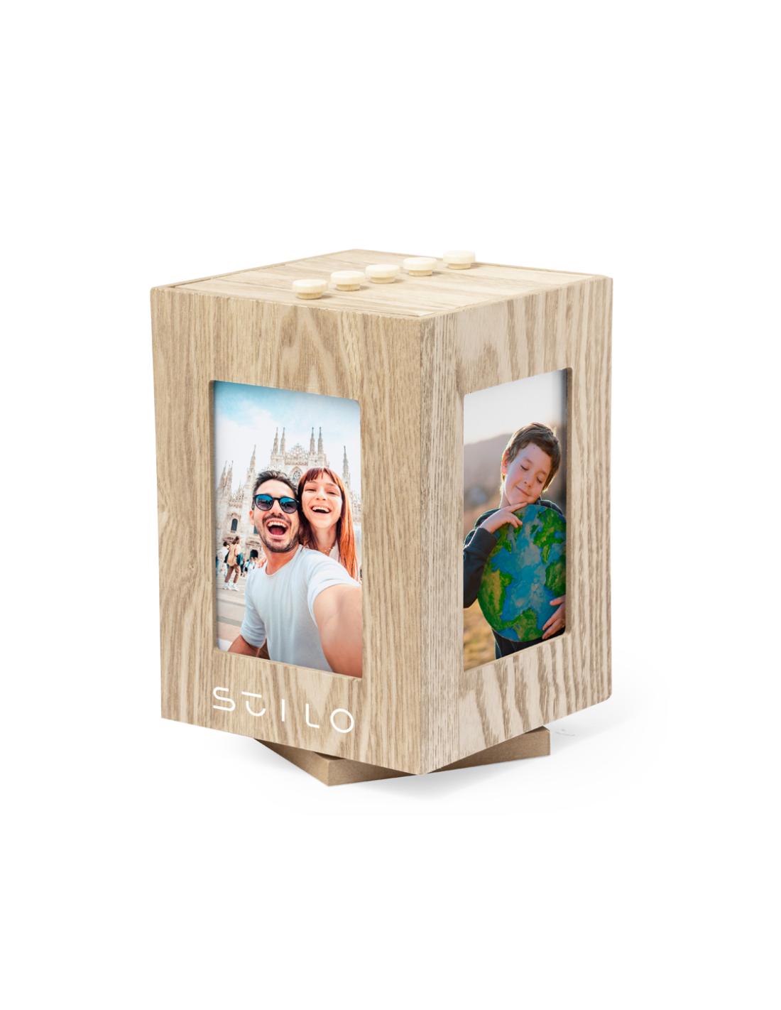 Original portafotos cubo fabricado en madera natural. Su diseño en forma de cubo permite mostrar las 4 fotos más destacadas del álbum y, además, cuenta con una base giratoria 360º. Ideal para fotos de hasta 13,5x9 cm. Presentado en caja individual de diseño kraft.