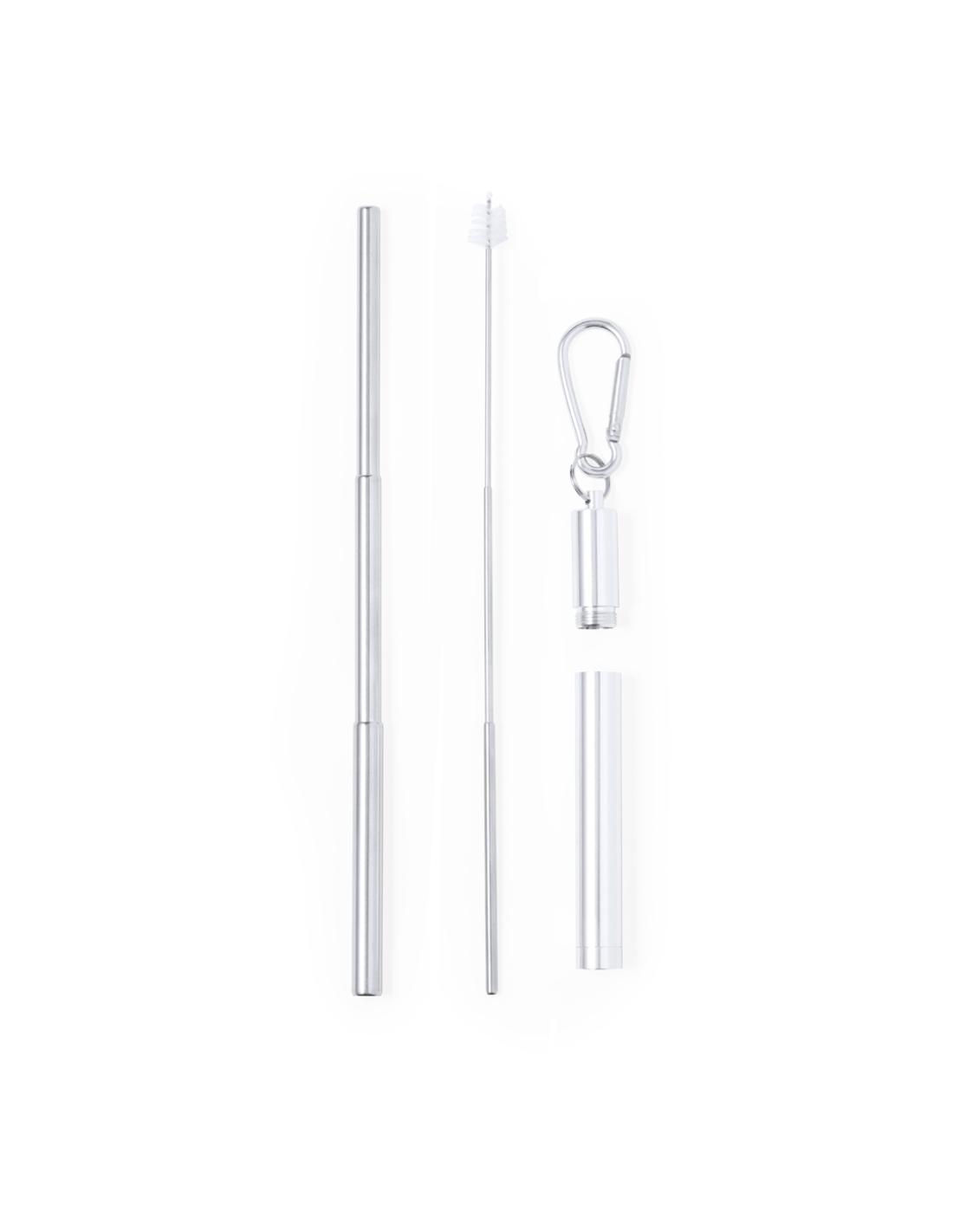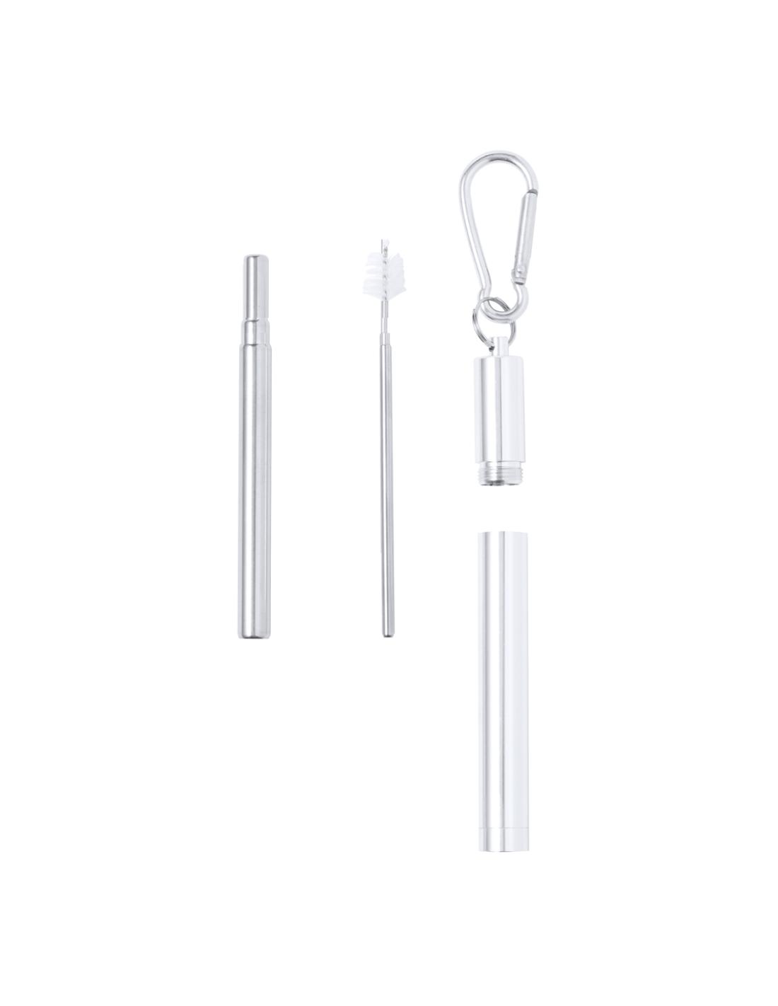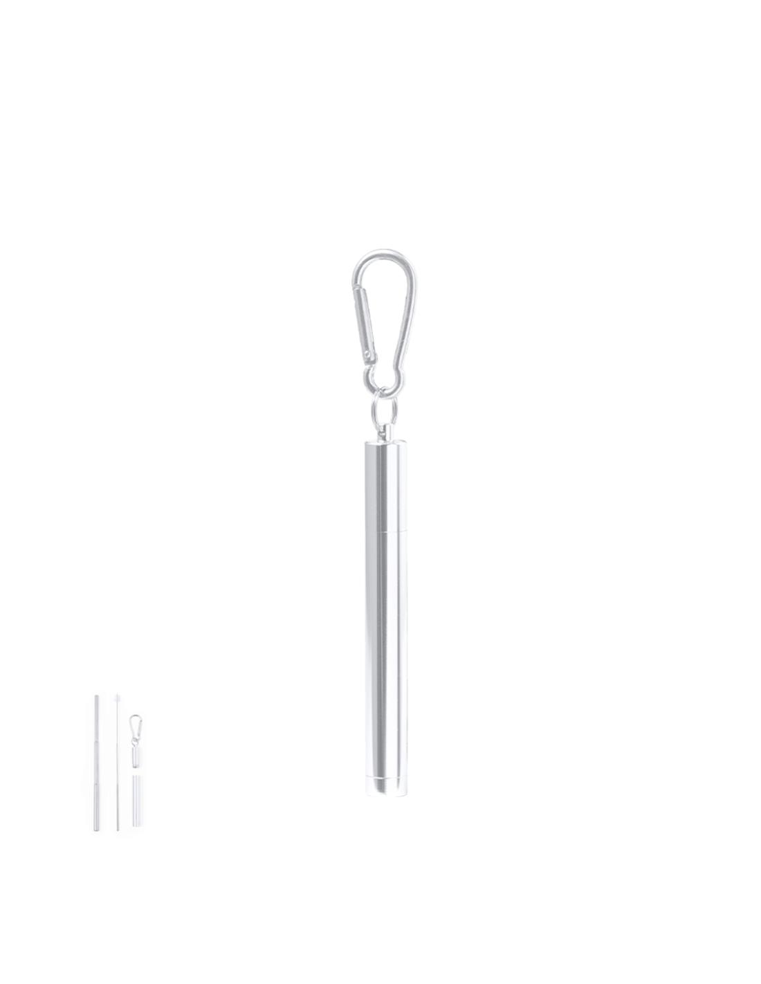 Pajita reutilizable y extensible en acero inox, con boquilla de silicona. Con accesorio limpiador incluido y presentada en estuche a juego con mosquetón para transporte.
