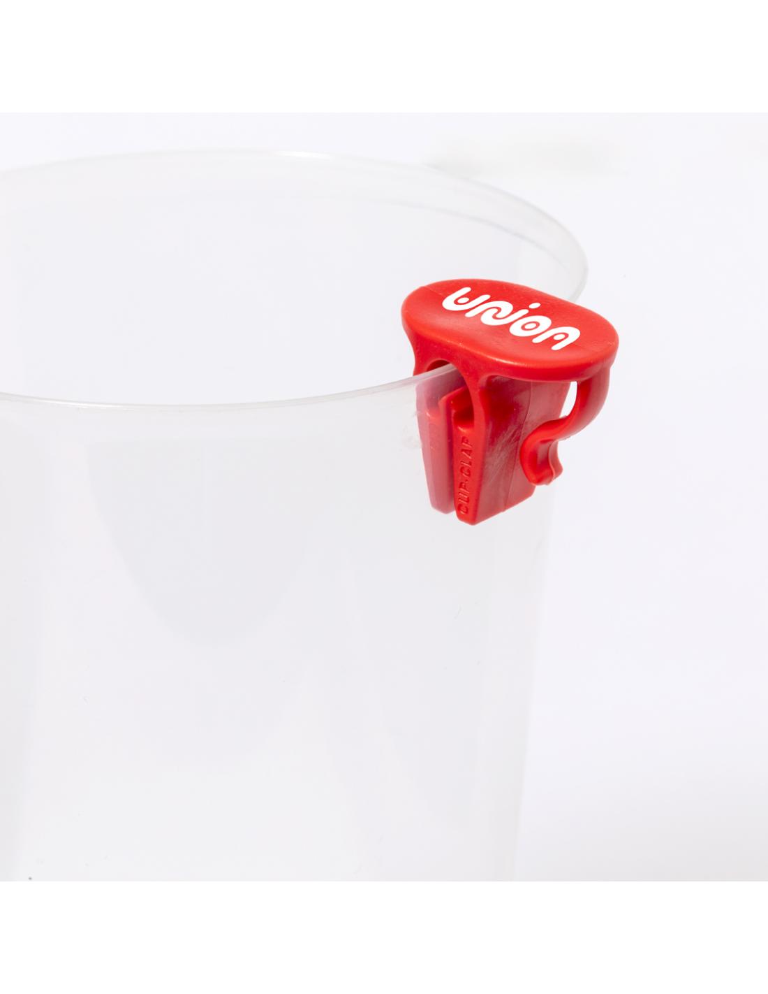 Práctica pinza portavasos fabricada en resistente ABS. Fácil de usar y adaptable a cualquier vaso. Con una superficie plana especial para personalización. Disponible en una variada gama de colores.