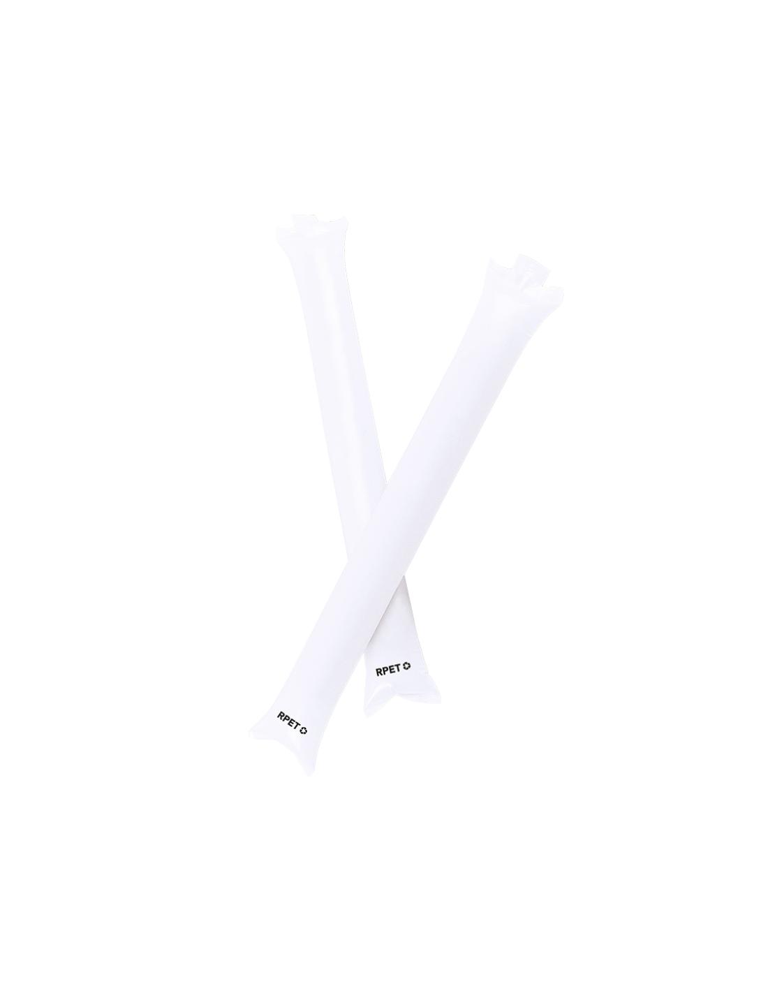 Par de bastom sticks/aplaudidores en resistente RPET y ruidoso material de color blanco. Reutilizables y con válvula de inflado incluida.El material RPET se elabora a partir de plástico reciclado, para así fomentar la reutilización de residuos plásticos y ayudar a la sostenibilidad del planeta. Presentado en bolsa de papel reciclada.