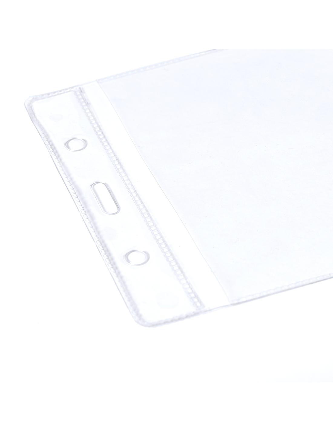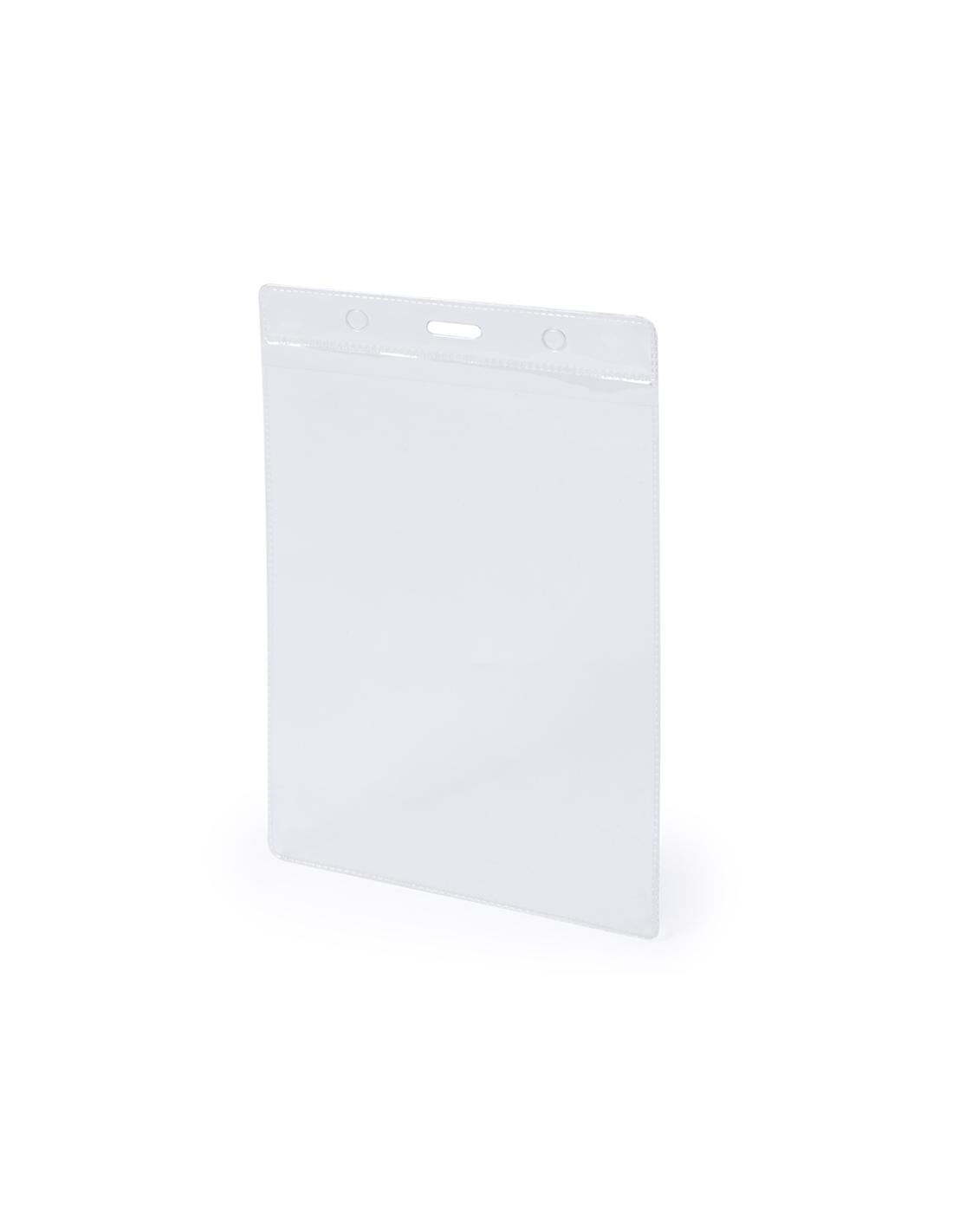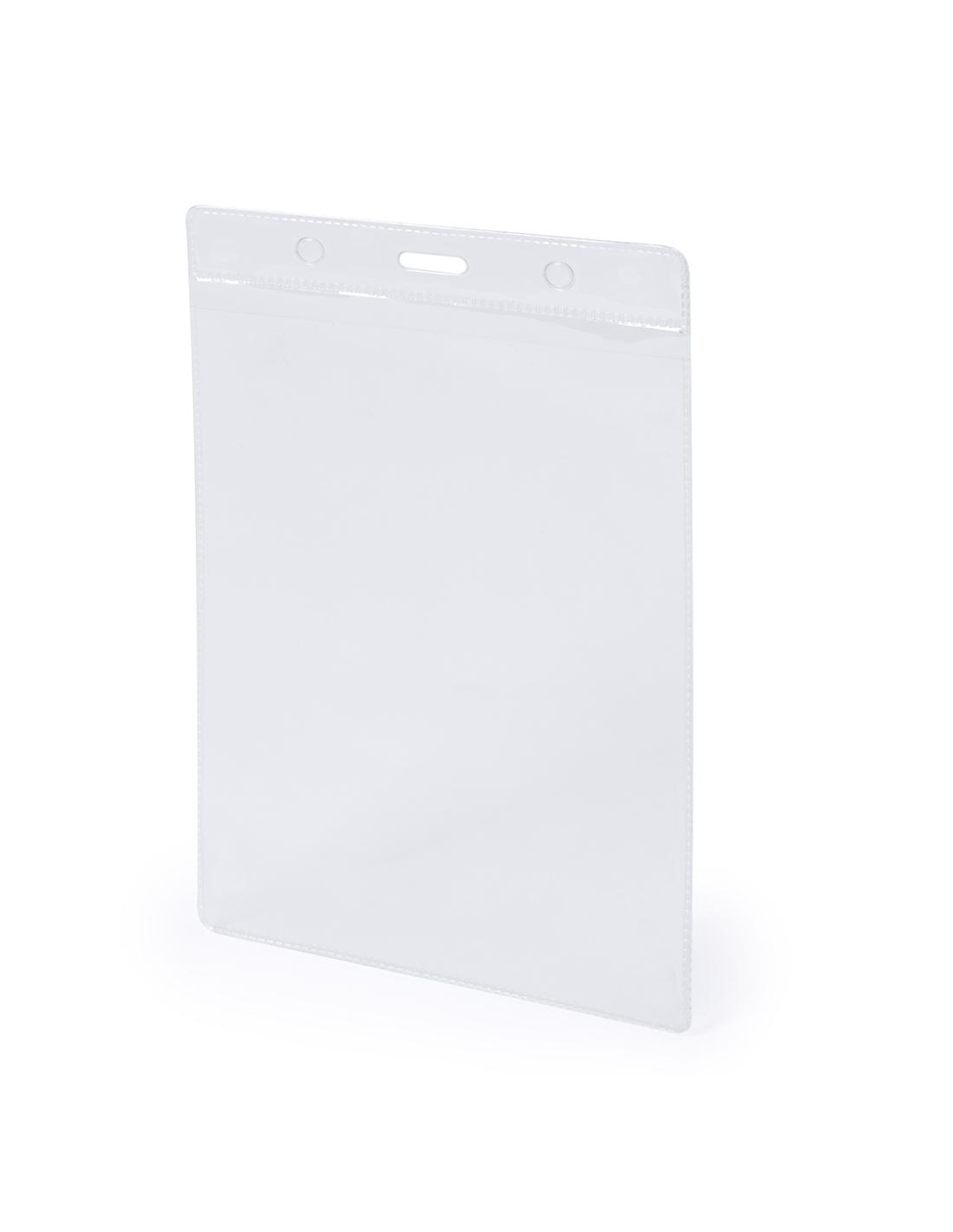 Identificador vertical de PVC. Práctico porta acreditaciones con parte superior reforzada y perforaciones tanto para la sujeción central como en los laterales.